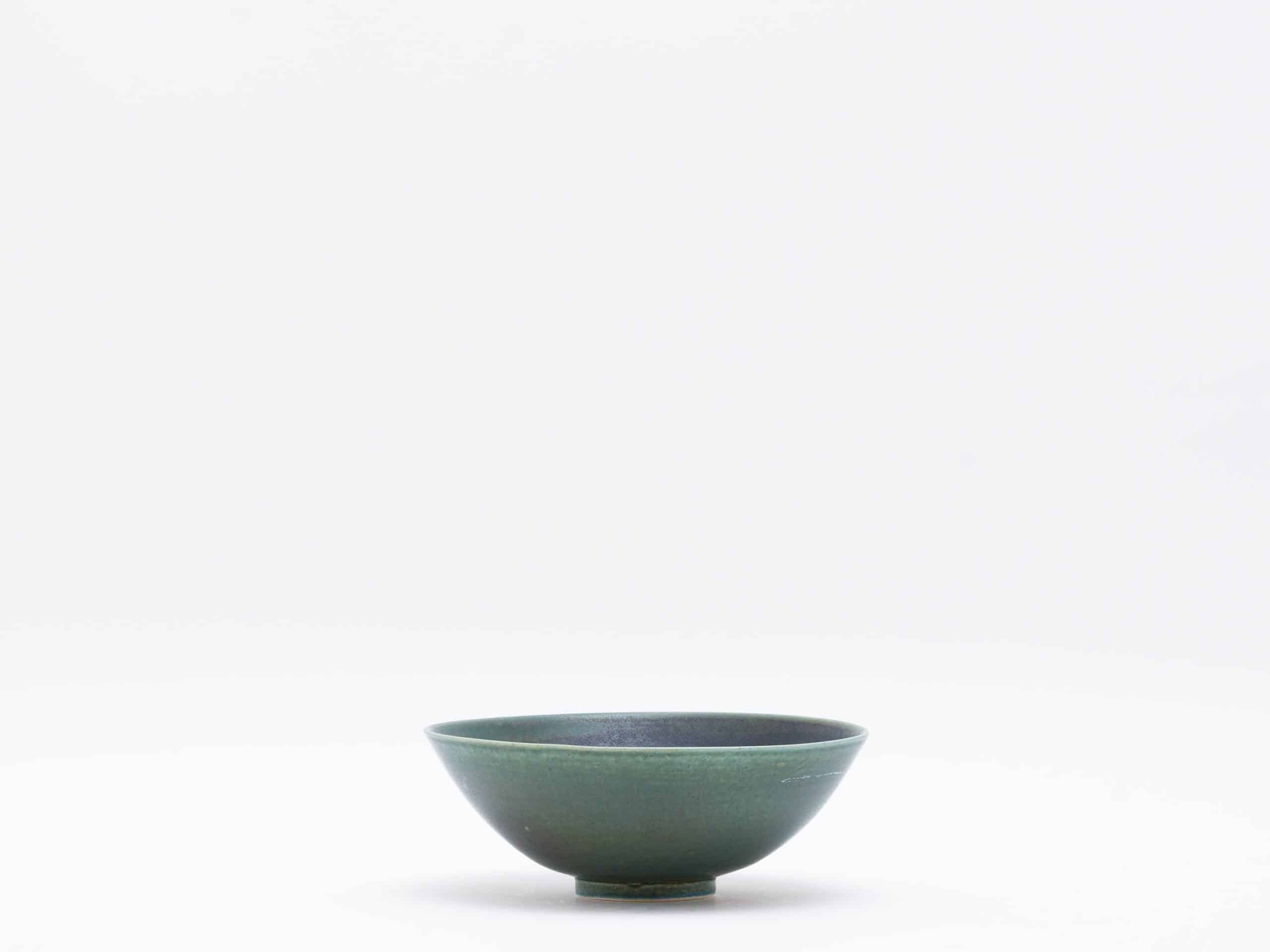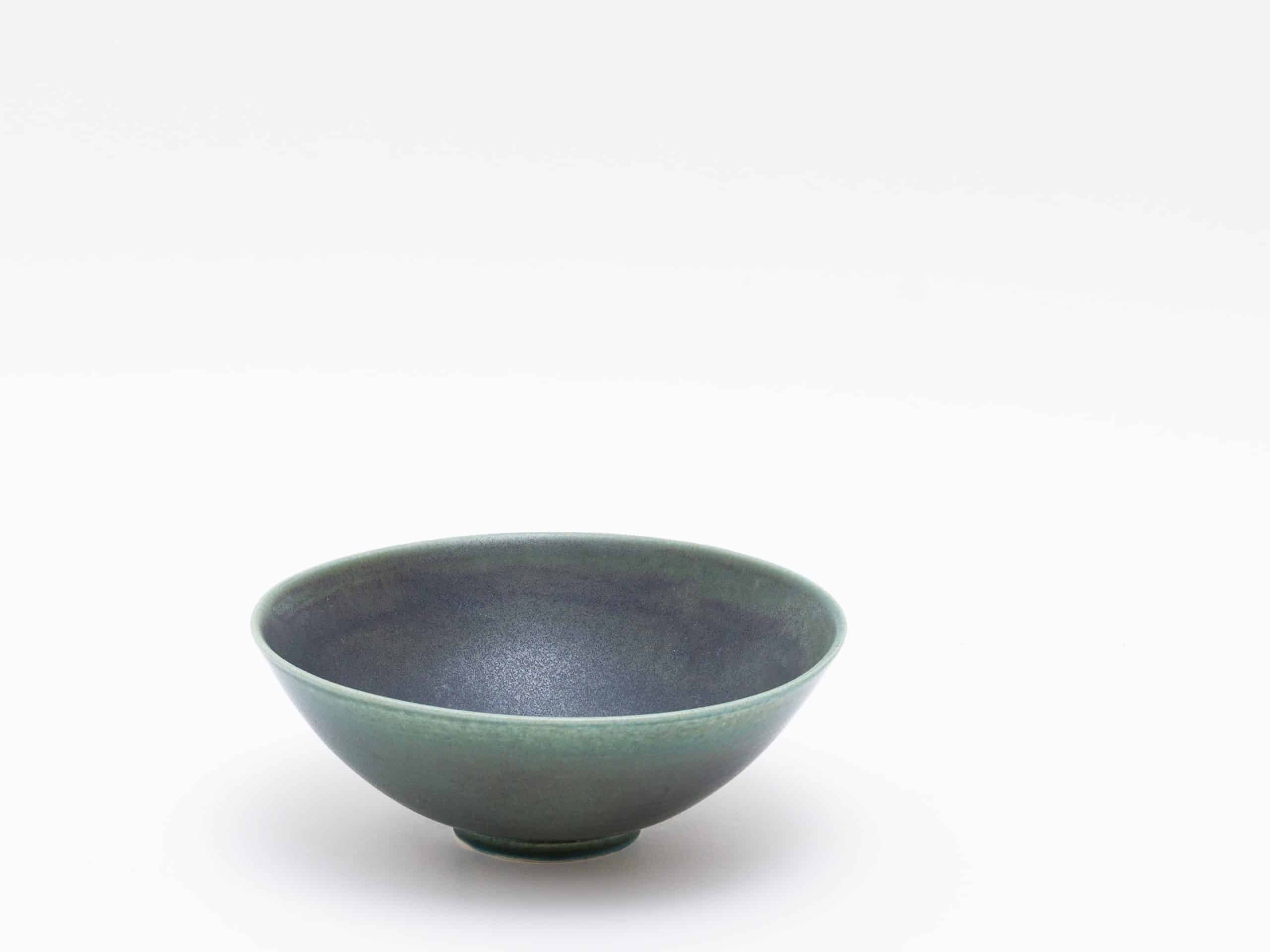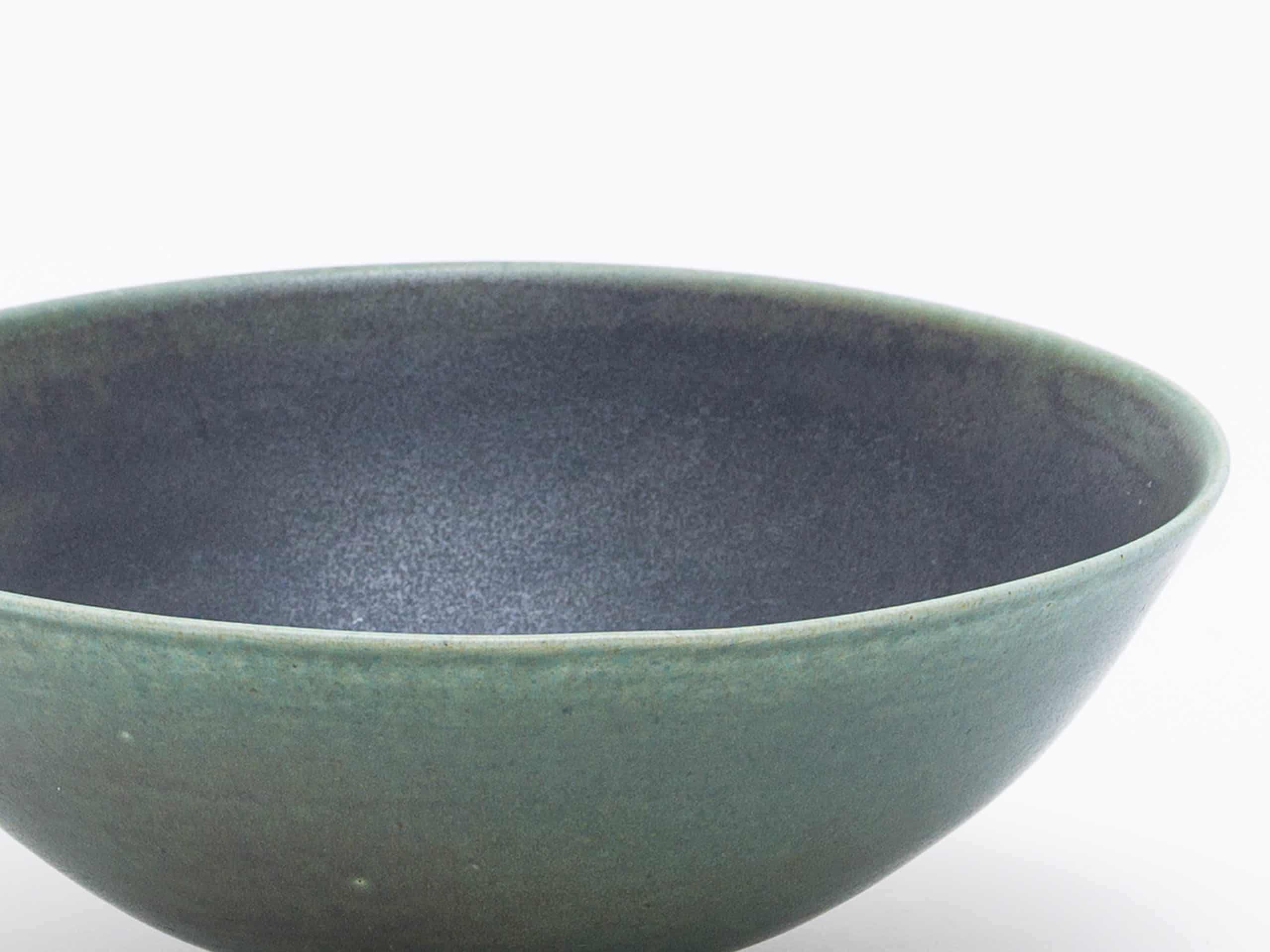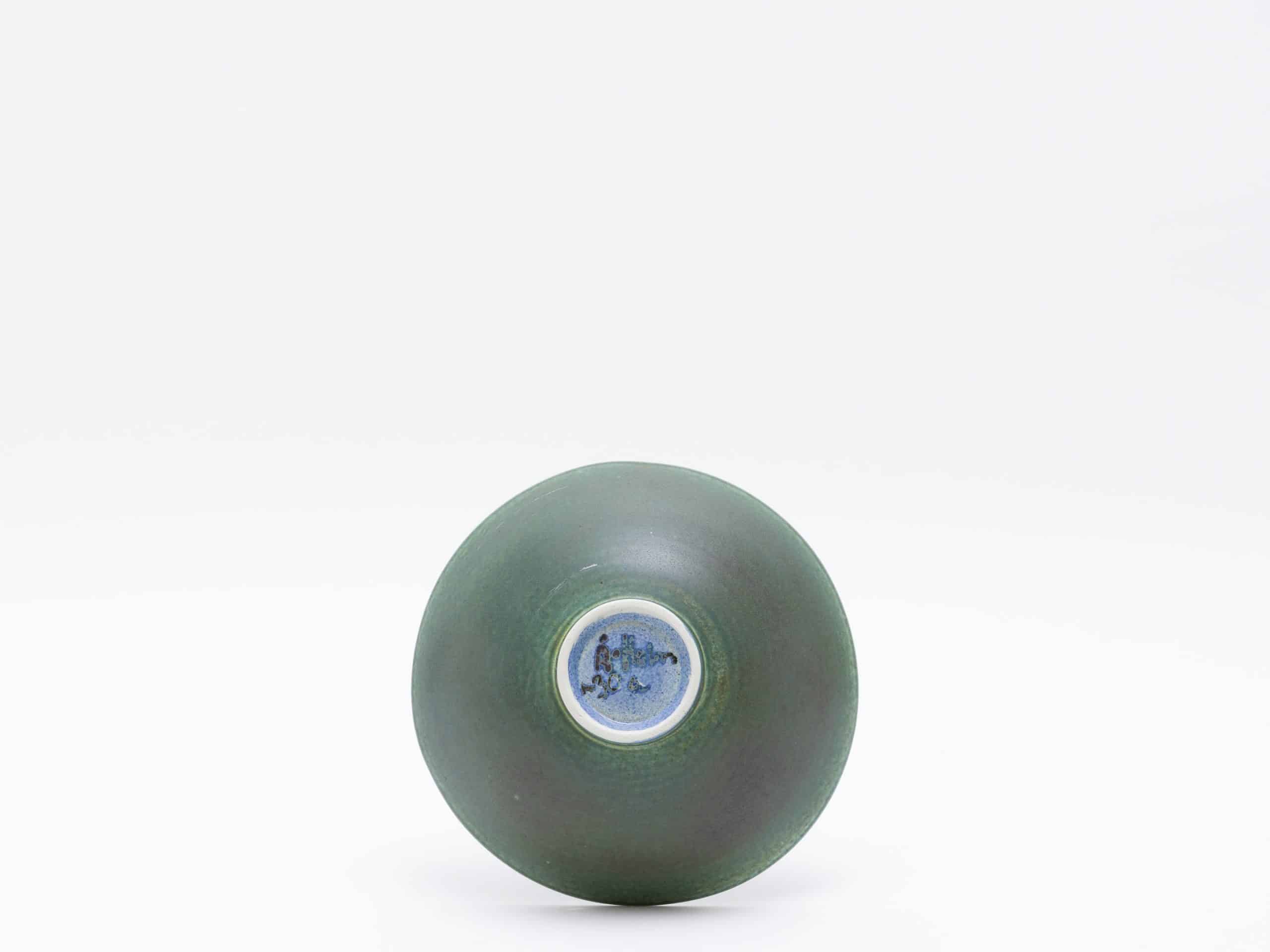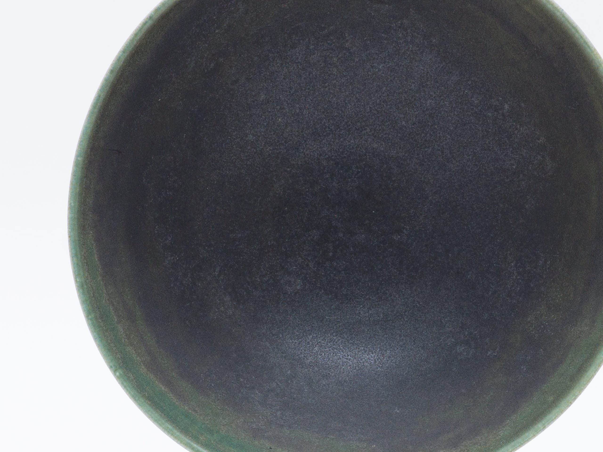 薄く挽かれた端正なフォルムは、彼が研究した東洋陶磁からの影響も感じさせます。深く落ち着いた緑色のマット釉が器全体を覆い、見込み(内側)は吸い込まれるような濃色を呈しており、静かなコントラストを生み出しています。