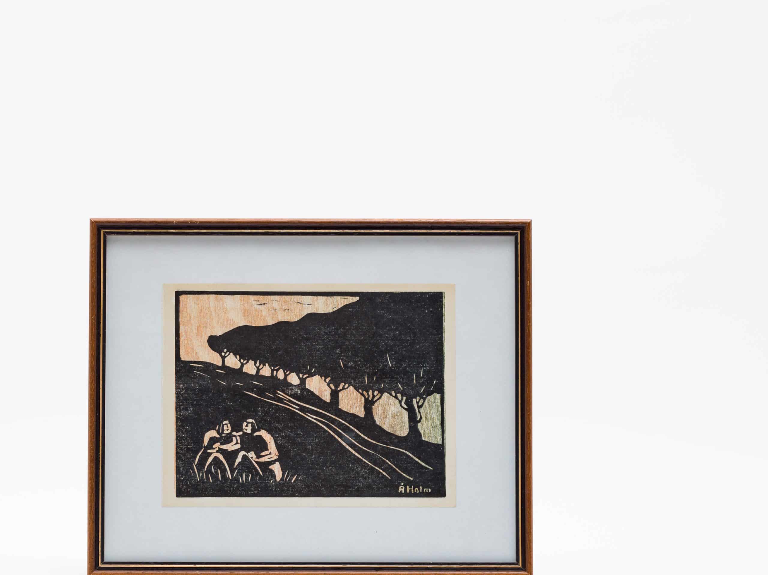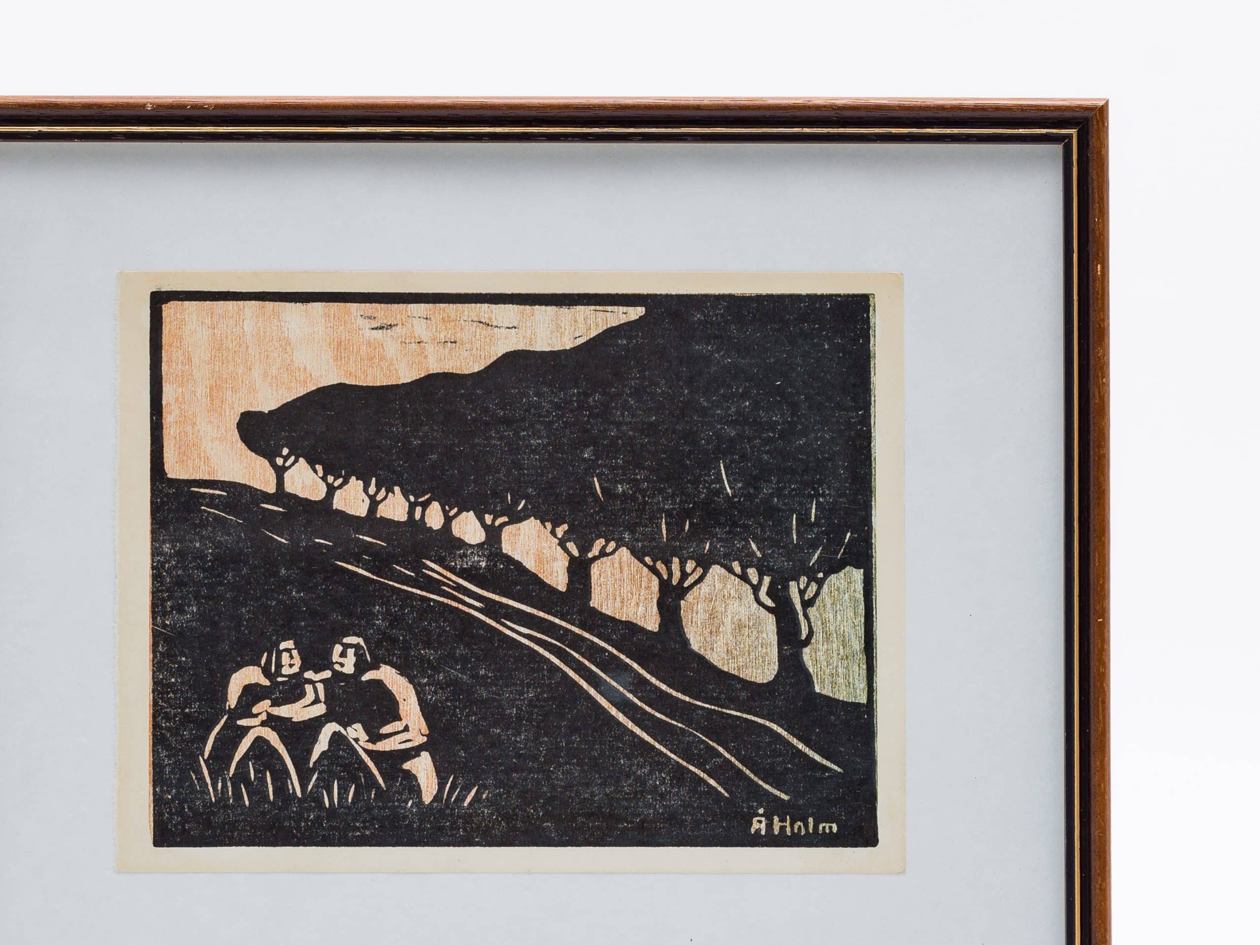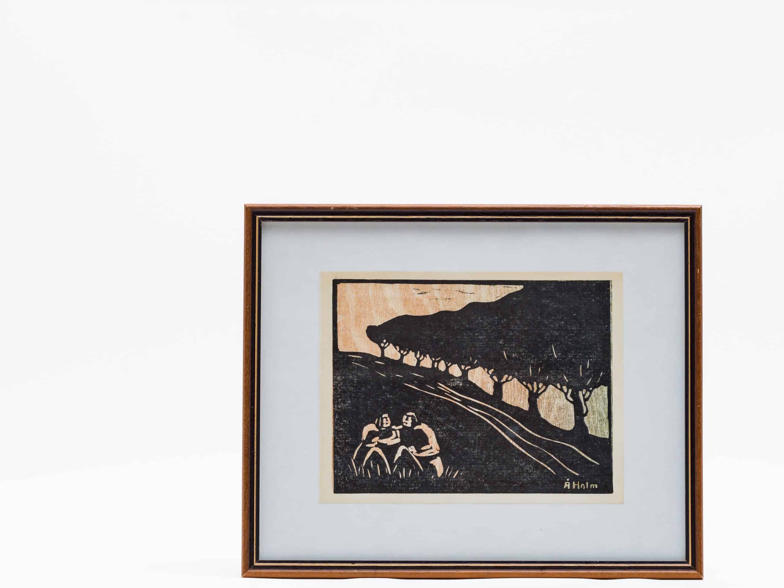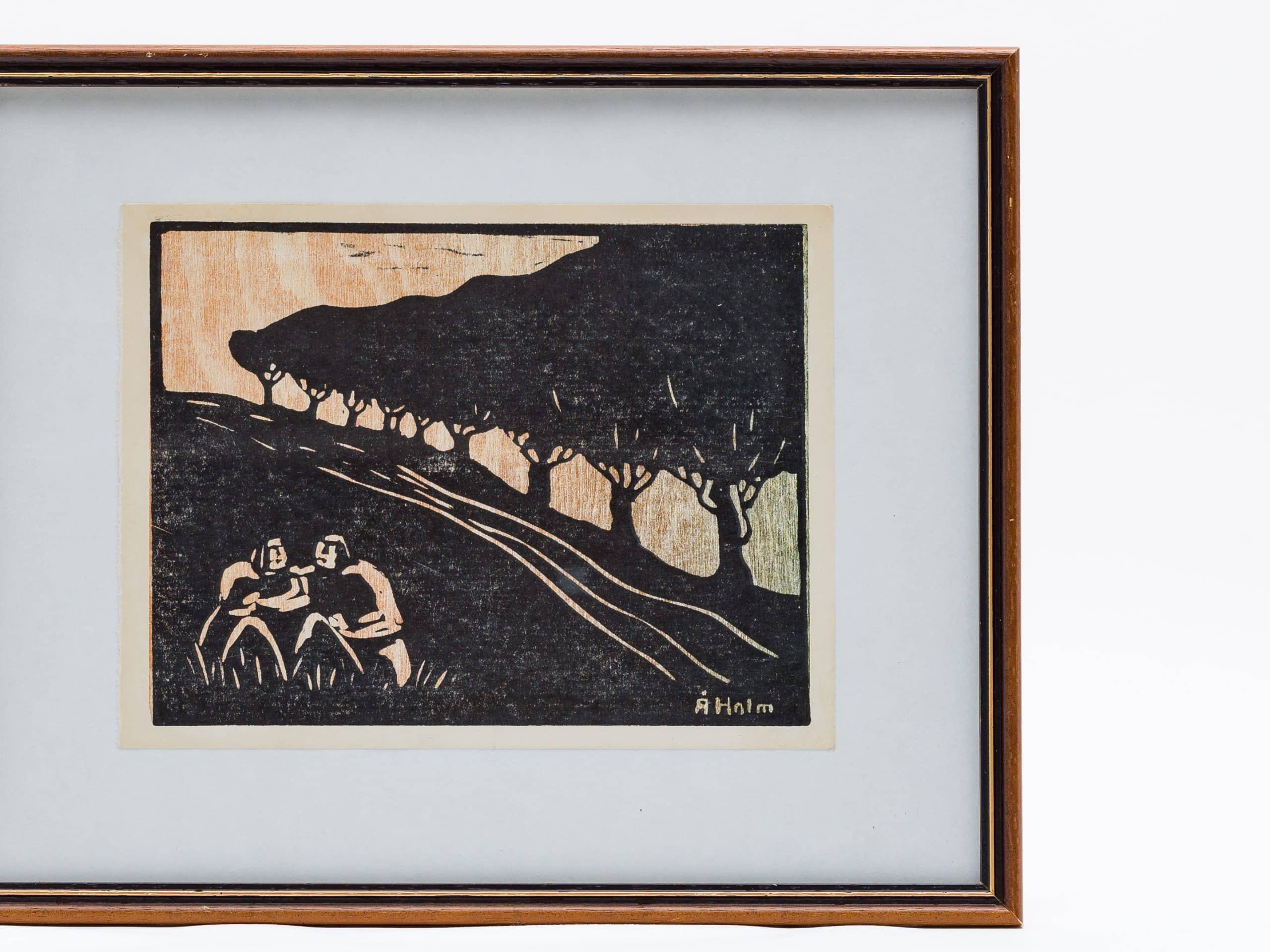 オーケ・ホルム(Åke Holm)が晩年に情熱を注いだ、リノリウム版画シリーズの一点です。力強い線描で捉えられた二人の人物が、緩やかに続く坂道で腰を下ろし、語り合う姿が描かれています。等間隔に並ぶ並木と遠くの丘陵地帯が、物語性を感じさせる空間を構成し、黒の諧調が静謐ながらも深い印象を与えます。