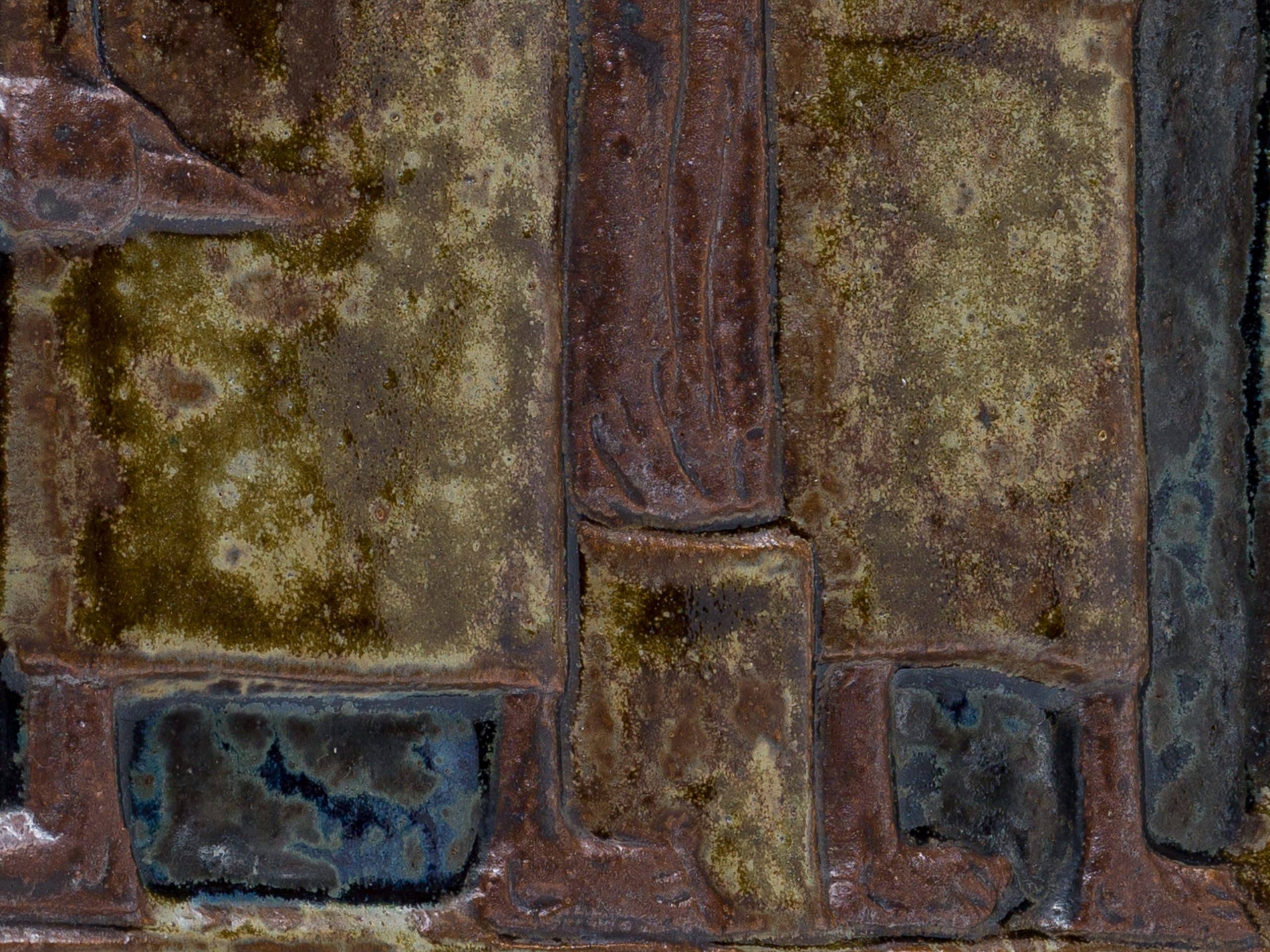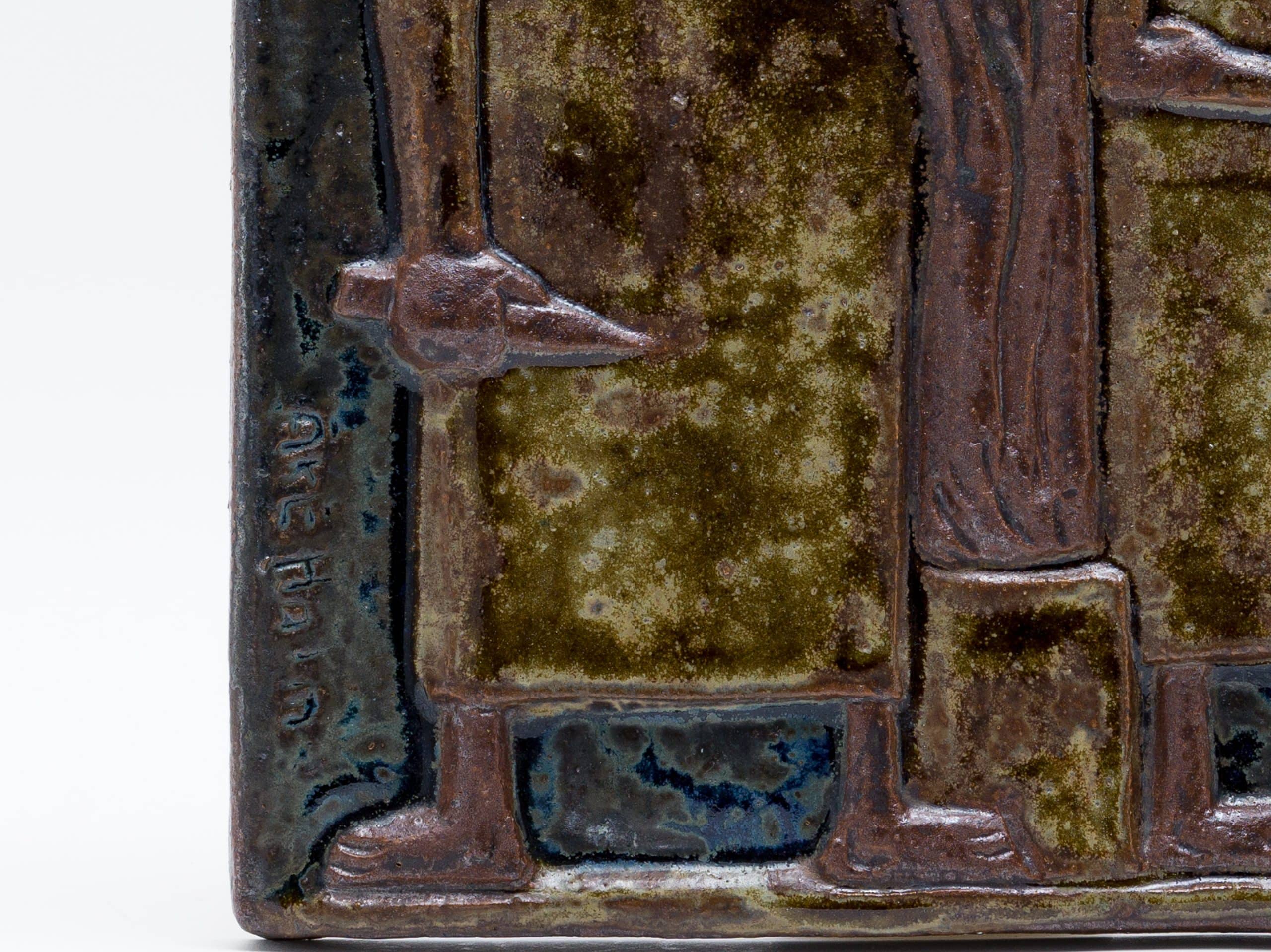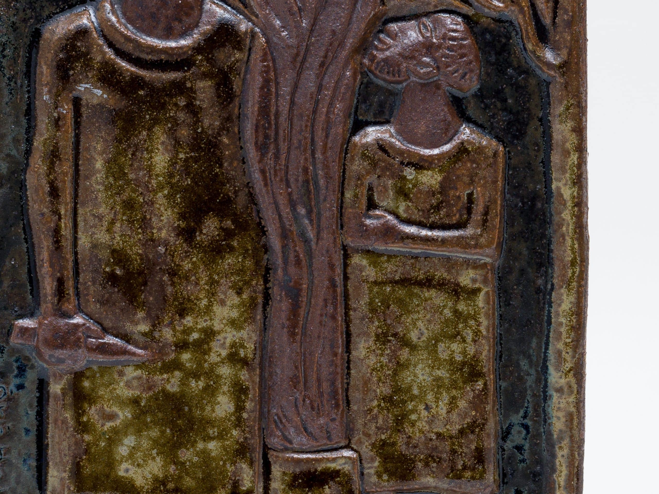 素材には、彼が得意としたシャモット(chamotte)を混ぜ込んだ炻器(stengods)が用いられ、土の粗い質感が作品に原始的な力強さを与えています。施された釉薬(glasyrer)は、茶褐色を基調とした落ち着いたアースカラーでまとめられており、聖書の主題が持つ厳粛な雰囲気を際立たせています。レリーフの凹凸によって釉薬に濃淡が生まれ、単色ながらも豊かな表情を見せている点は、ホルムの卓越した技術の表れです。