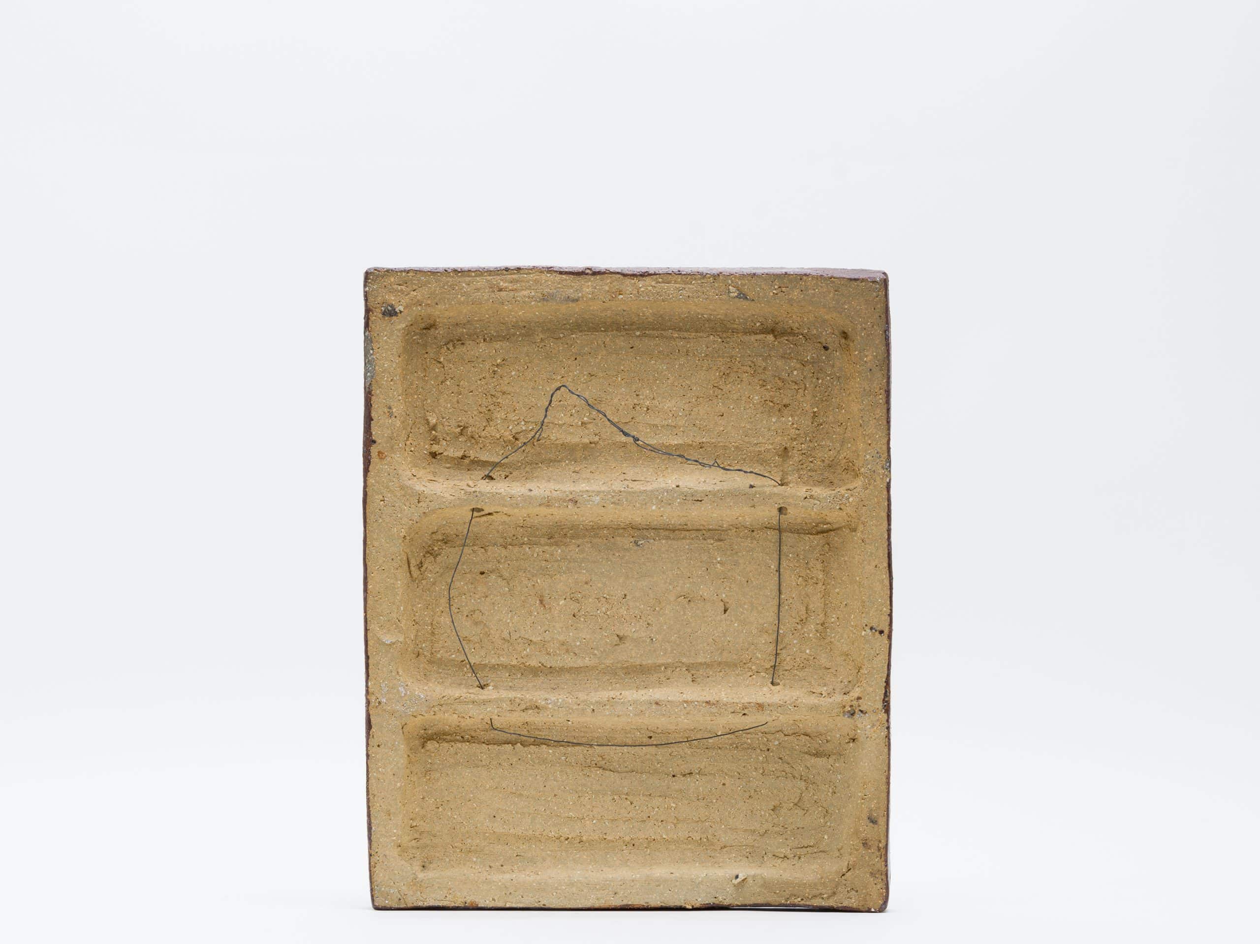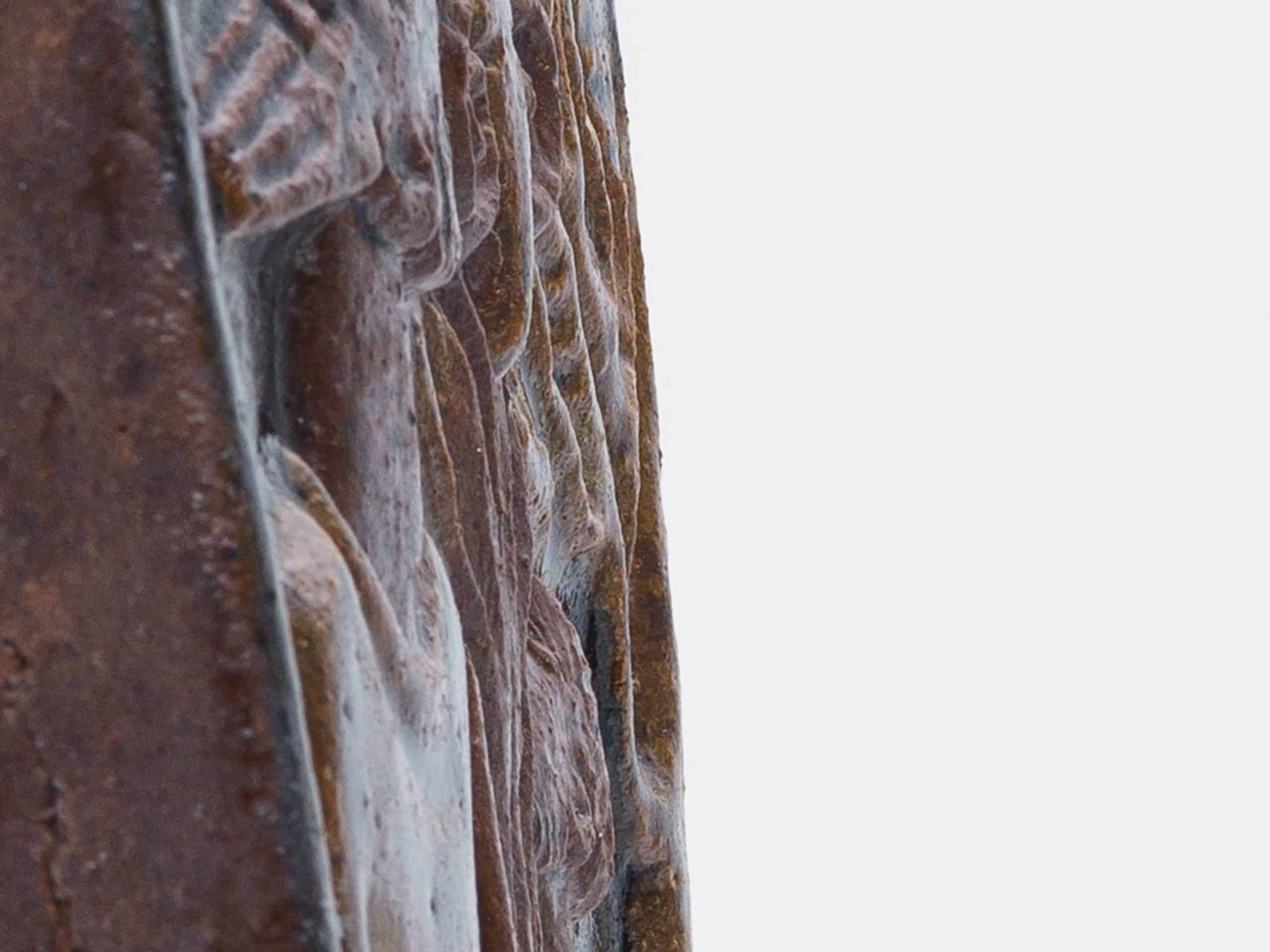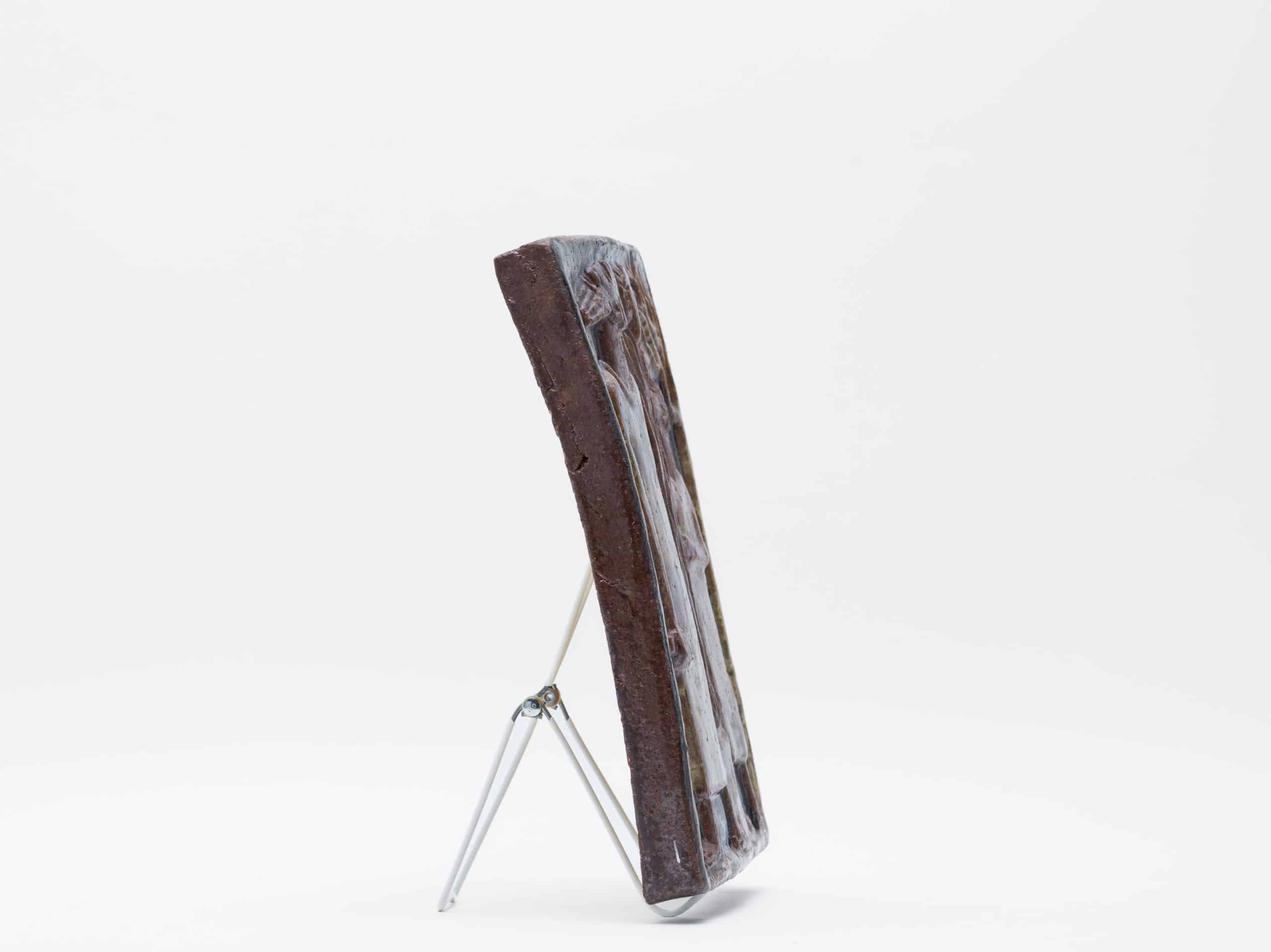 素材には、彼が得意としたシャモット(chamotte)を混ぜ込んだ炻器(stengods)が用いられ、土の粗い質感が作品に原始的な力強さを与えています。施された釉薬(glasyrer)は、茶褐色を基調とした落ち着いたアースカラーでまとめられており、聖書の主題が持つ厳粛な雰囲気を際立たせています。レリーフの凹凸によって釉薬に濃淡が生まれ、単色ながらも豊かな表情を見せている点は、ホルムの卓越した技術の表れです。