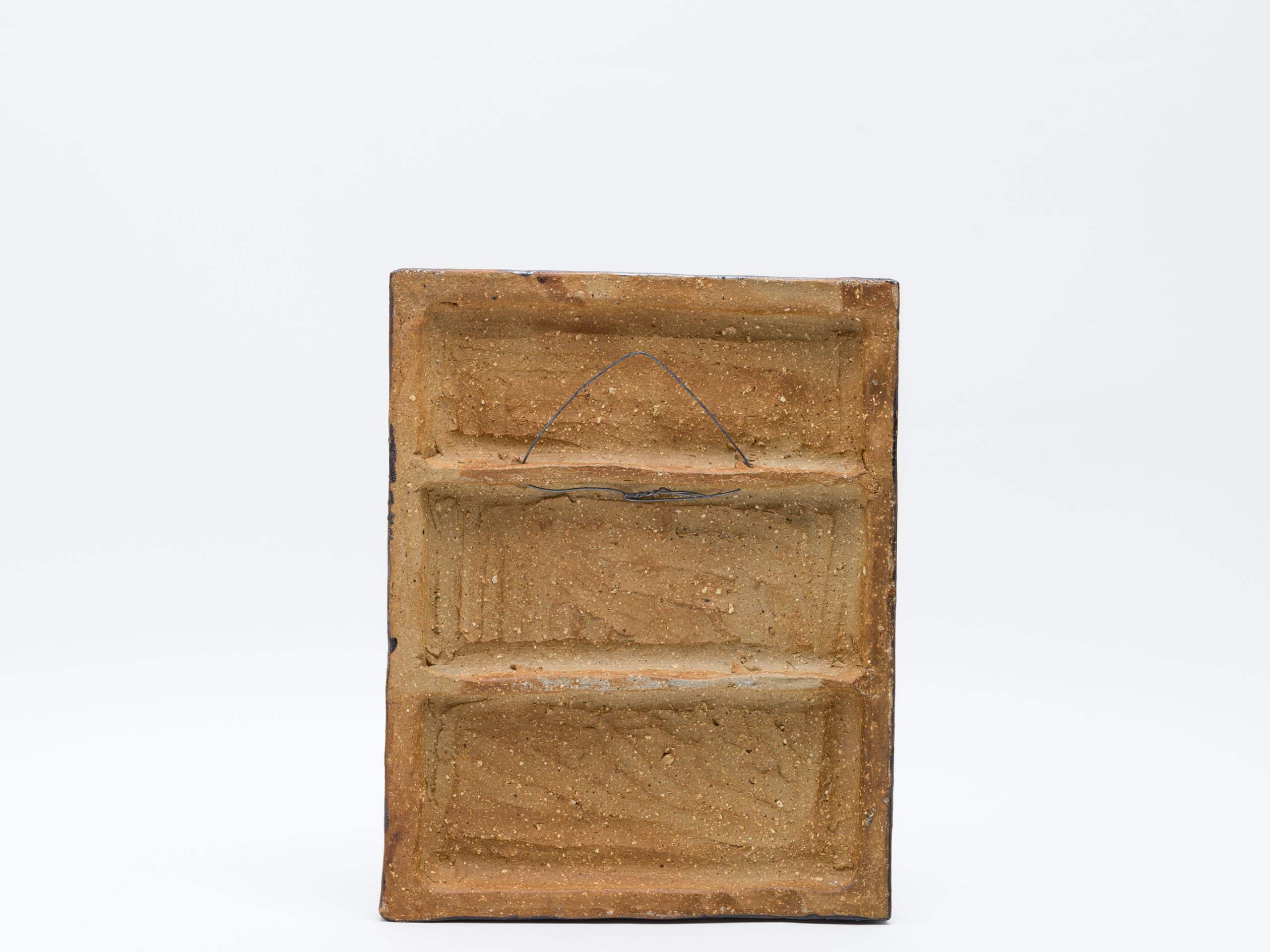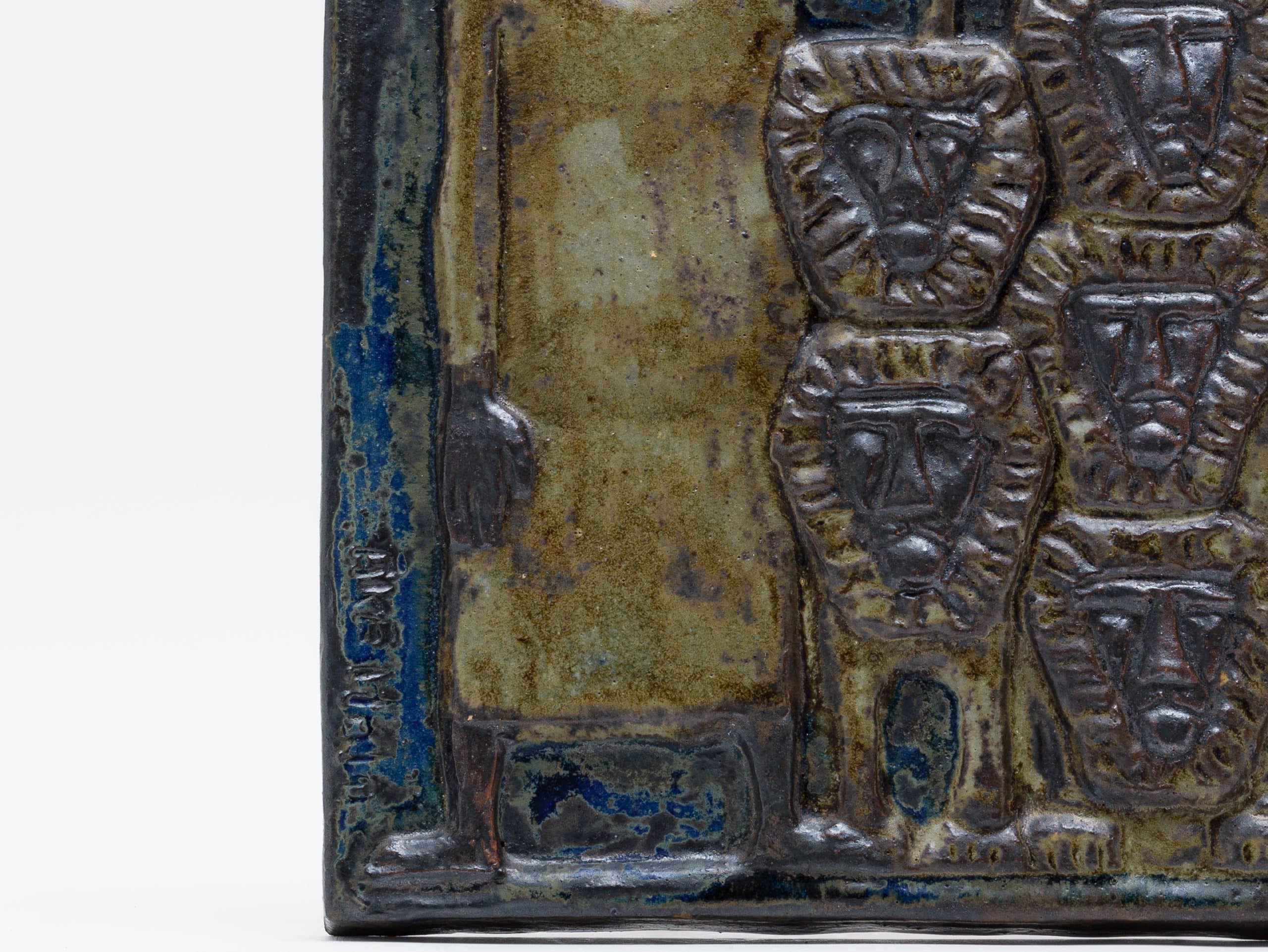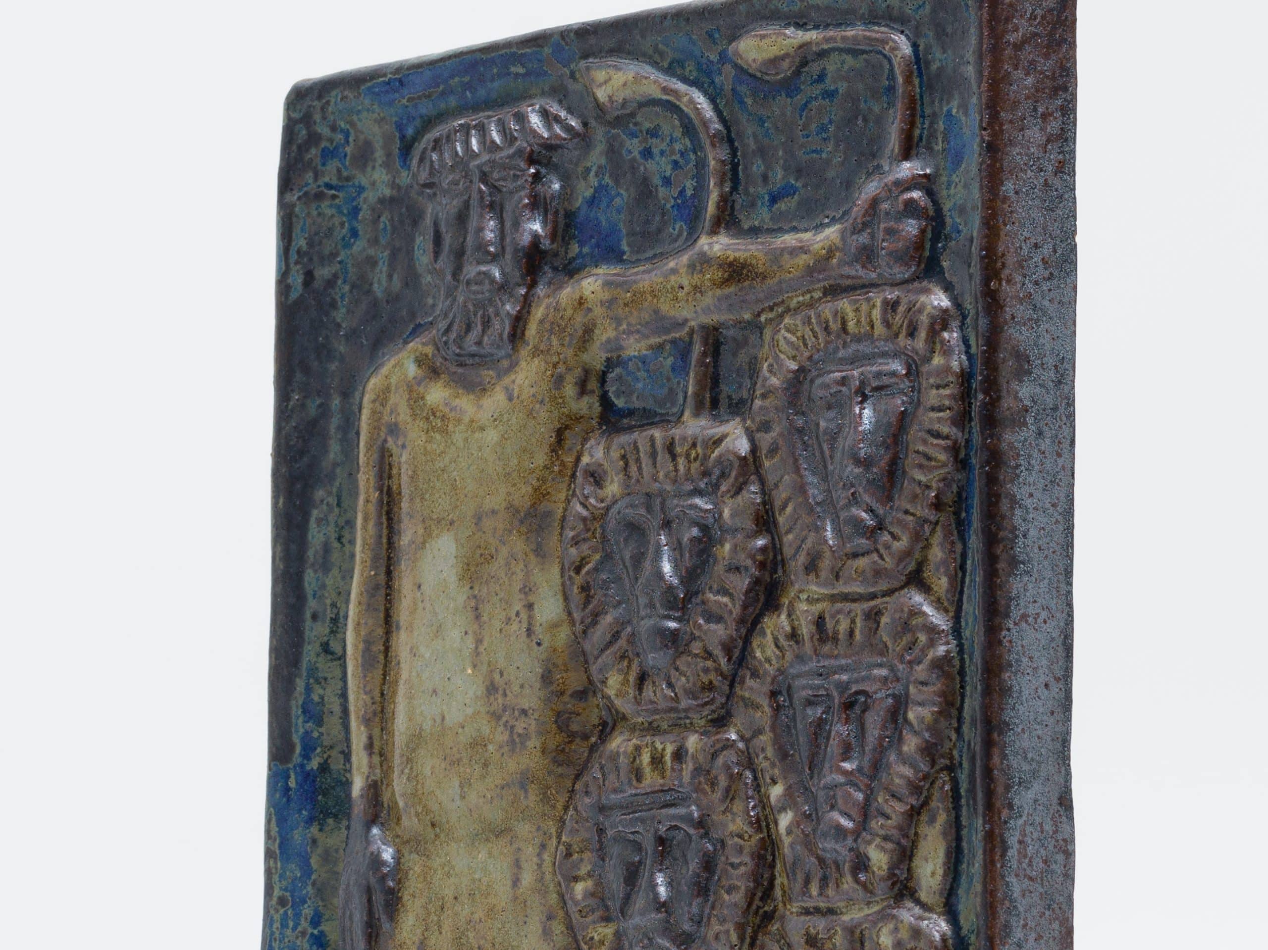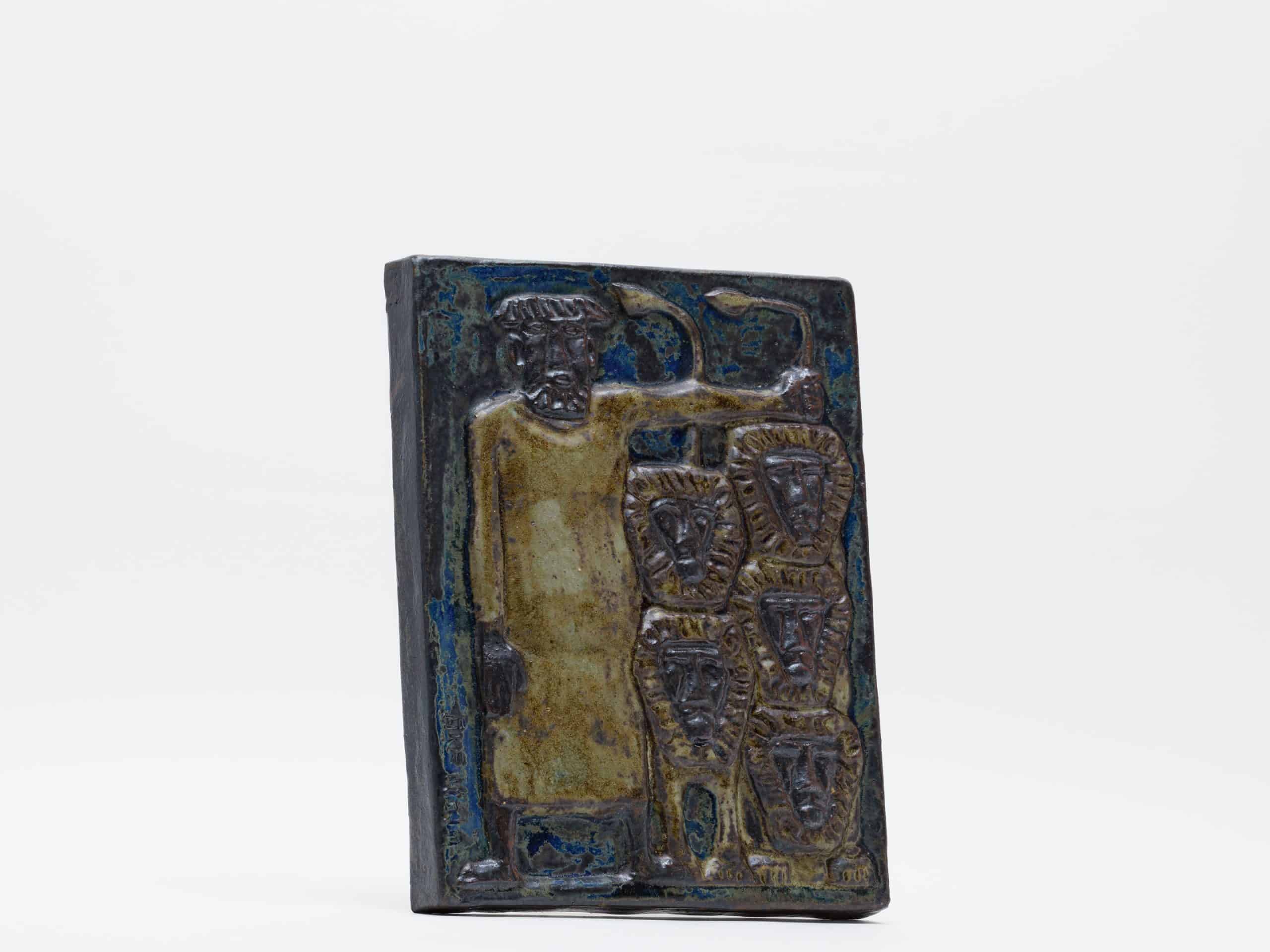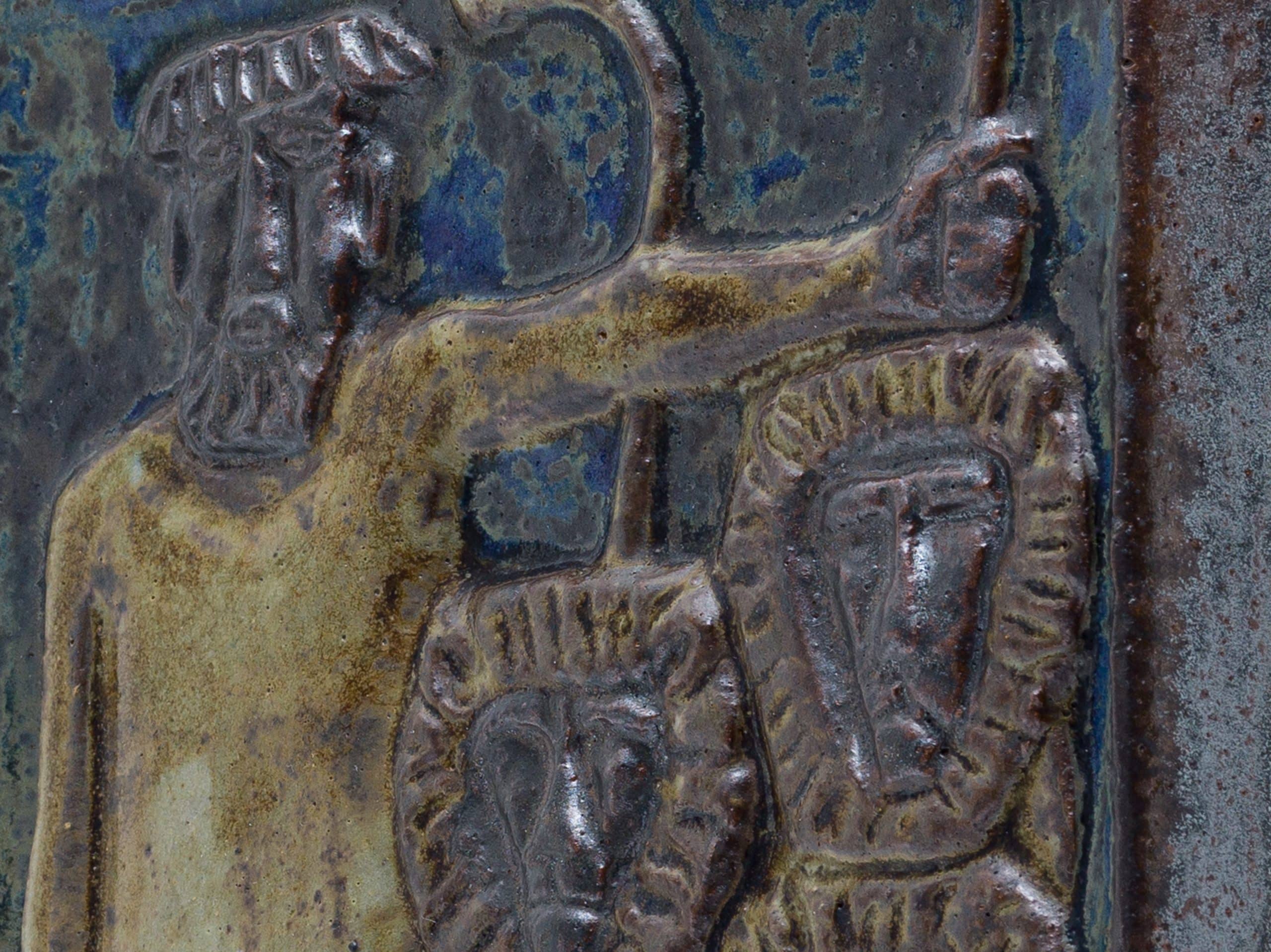 ホルムは気に入ったモチーフが完成すると、石膏型を制作しました。そして、その型に粘土を押し込むことで、同じ構図の作品を複数制作することが可能になりました。この技法により、彼は優れた芸術作品を、当時の絵画に代わる比較的手頃な選択肢として人々に提供することができたのです。本作も、そうした石膏型を用いて制作された可能性が高い一点です。素材には、彼の作品に特徴的な粗い質感を生み出すシャモット(chamotte)を混ぜ込んだ炻器(stengods)が用いられています。施された釉薬(glasyrer)は、背景の深いコバルトブルーと、人物や獅子に使われた茶褐色の鉄釉が美しい対比をなし、作品に重厚さと奥行きを与えています。レリーフの凹凸によって釉薬に濃淡が生まれ、単色ながらも豊かな表情を見せている点は、ホルムの卓越した技術の表れです。