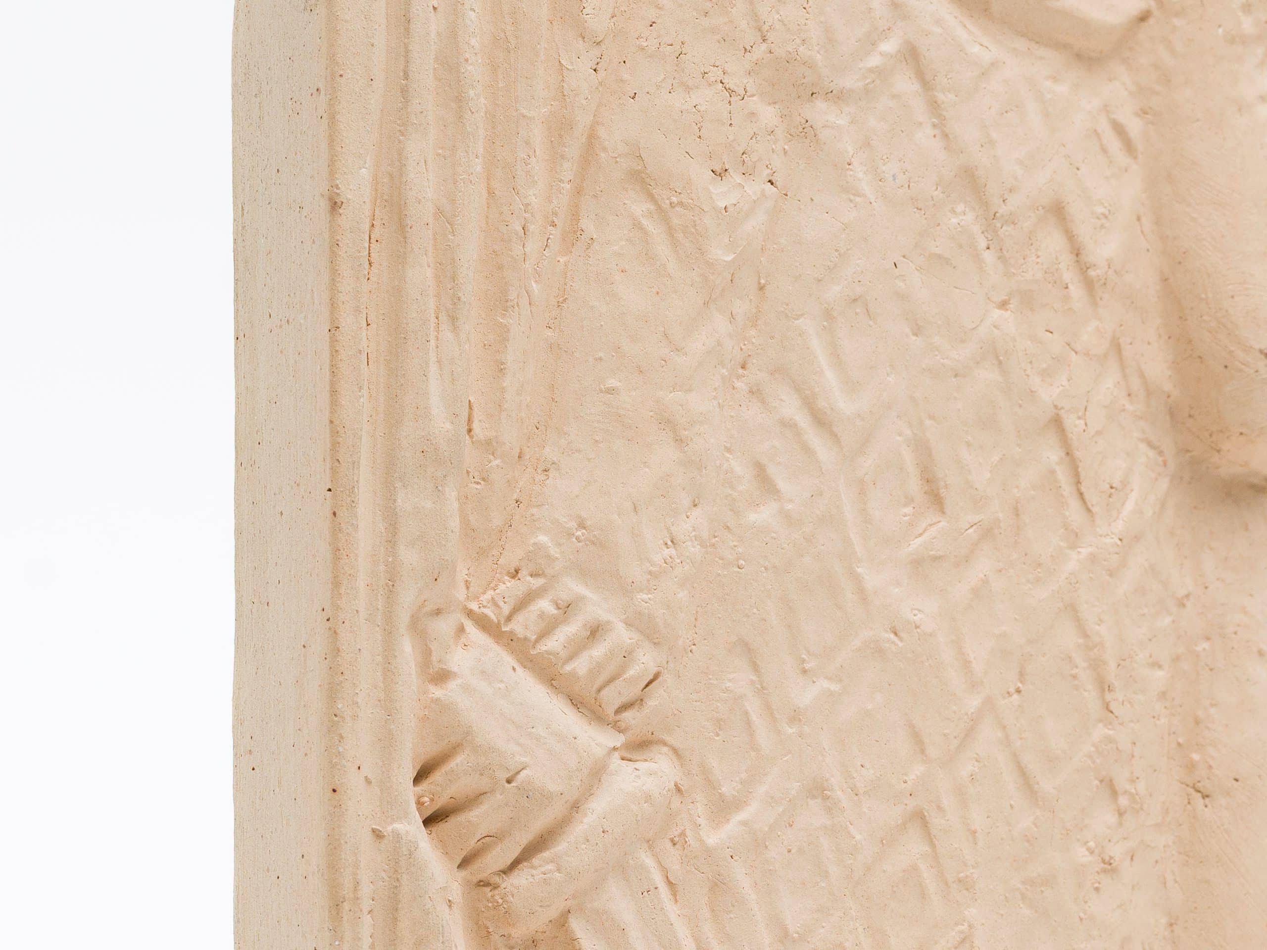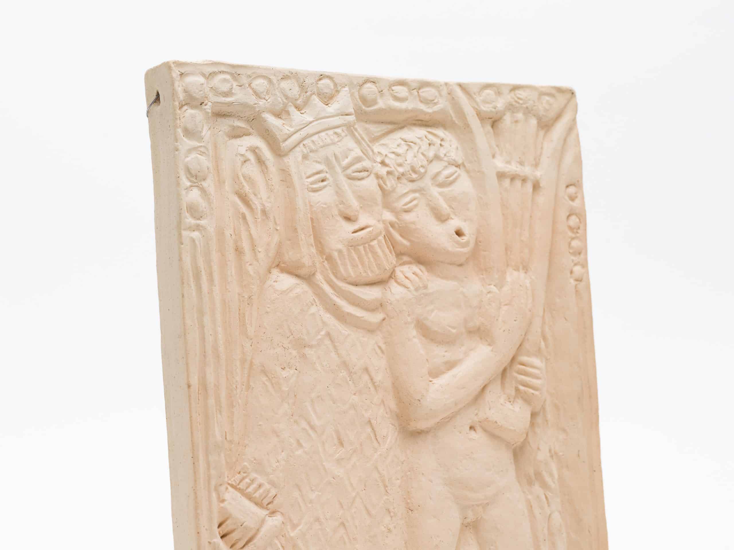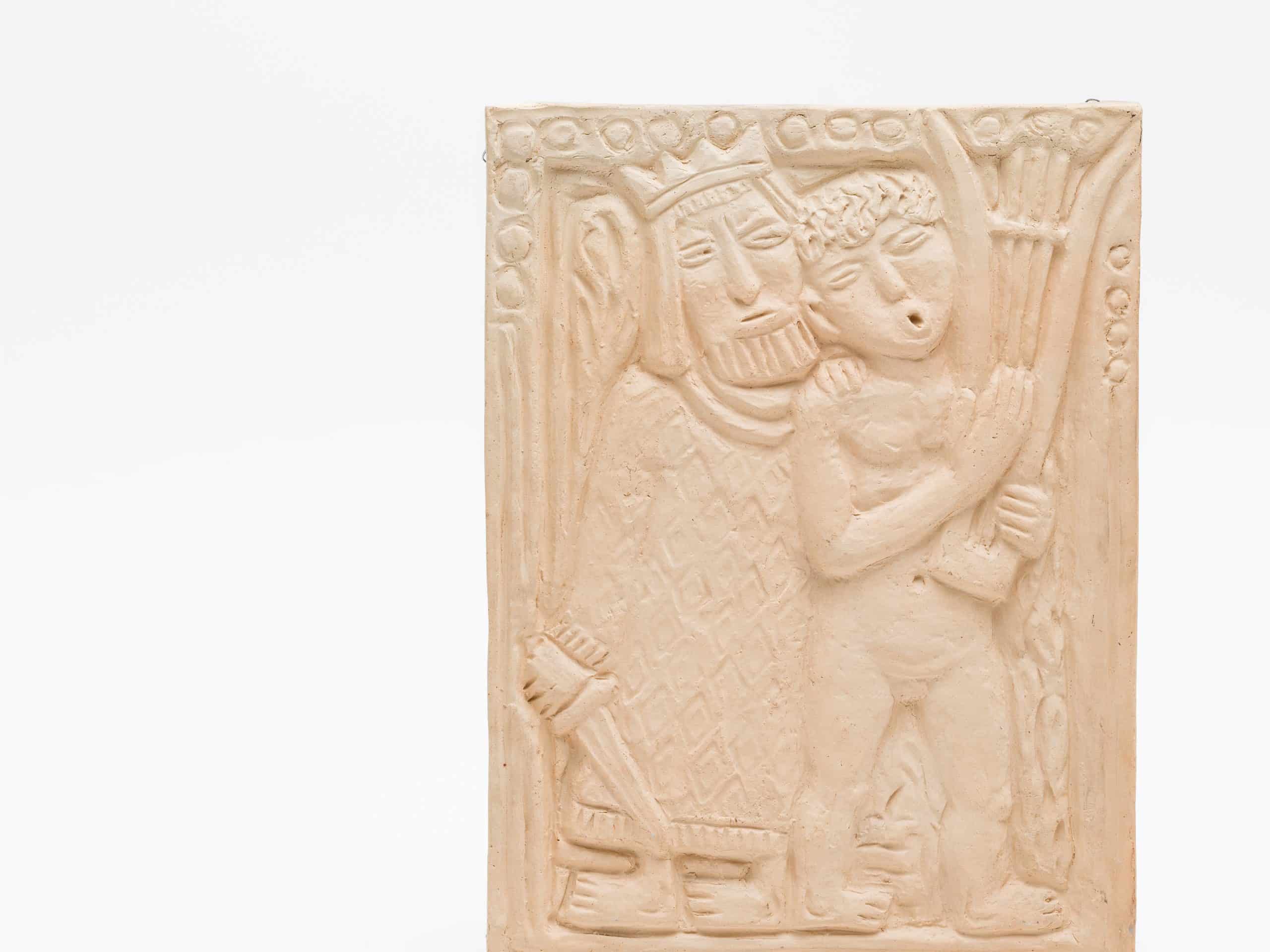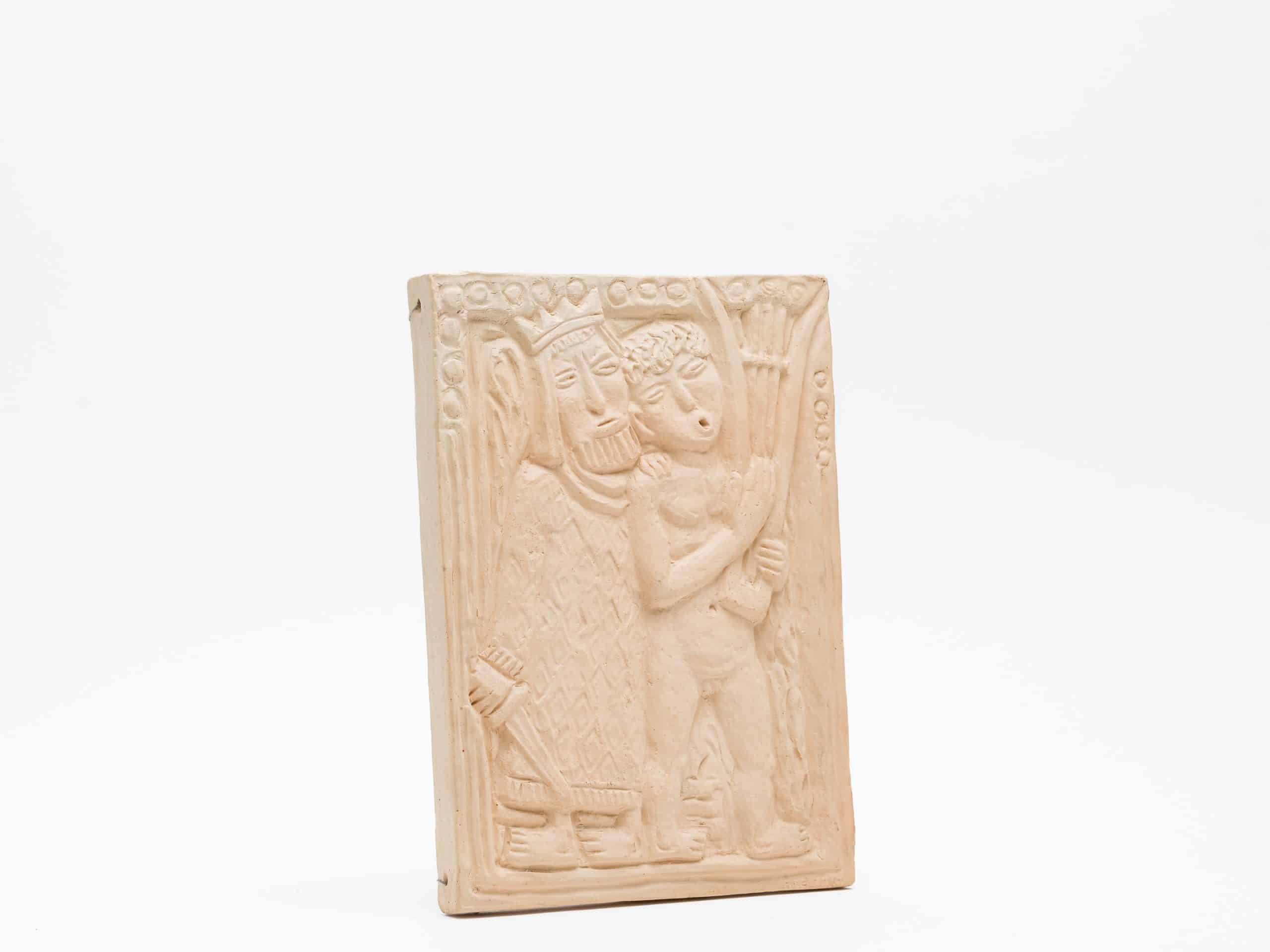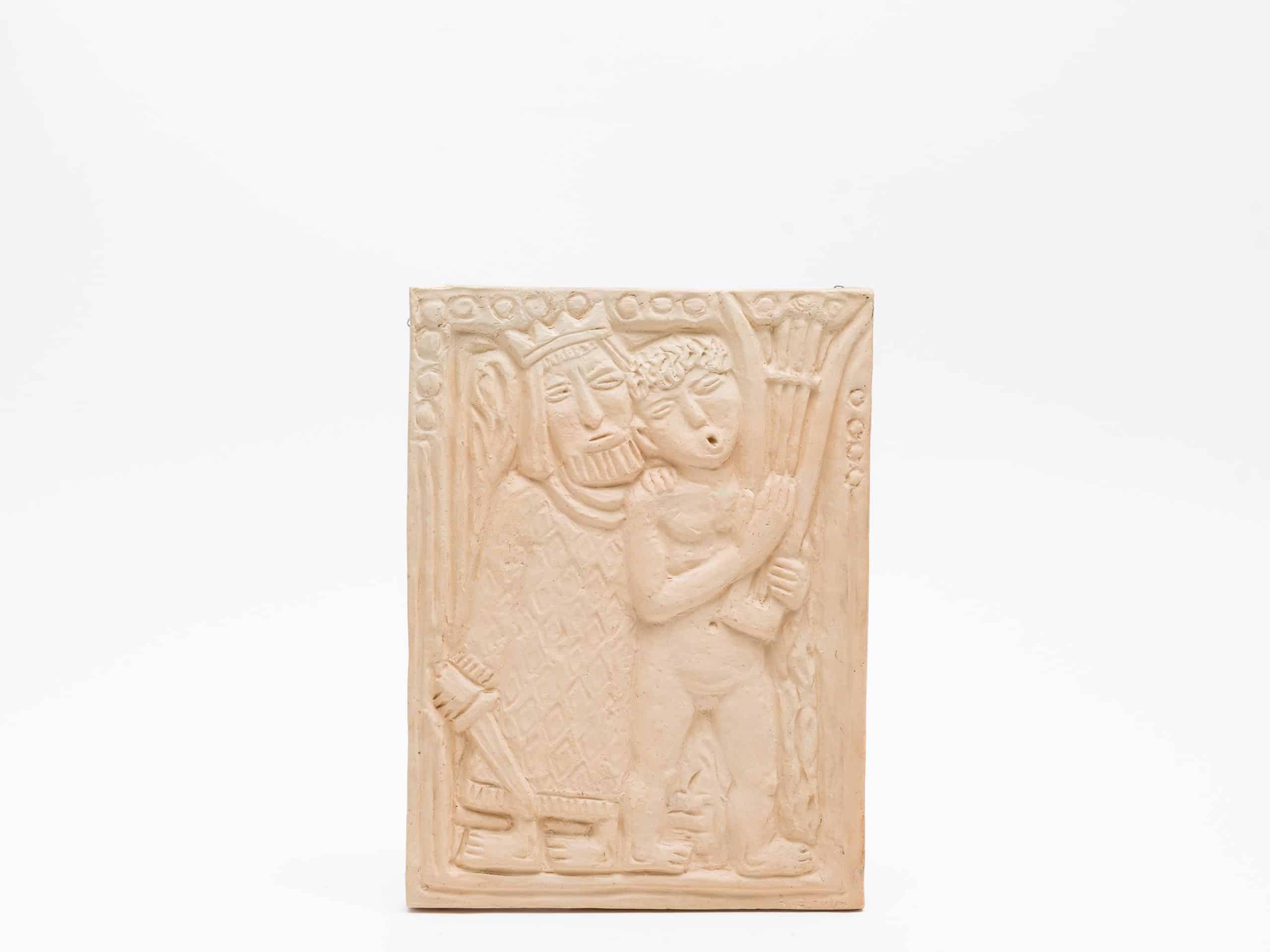 無釉のテラコッタで聖書の物語を表現する作風は、ホルムが自身の芸術スタイルを確立した1930年代の作品に多く見られる特徴です。王冠を戴くアブラハムの厳粛な表情と、薪を抱え父に寄り添うイサクの姿が、素朴ながらも力強い線で描かれています。父子の間の複雑な心情や物語の劇的な瞬間を、ホルムならではの人間味あふれる表現で描き出した一点です。後の重厚な炻器(stengods)作品とは趣を異にする、ホルムの創作活動における一つの重要なスタイルを伝える作品です。