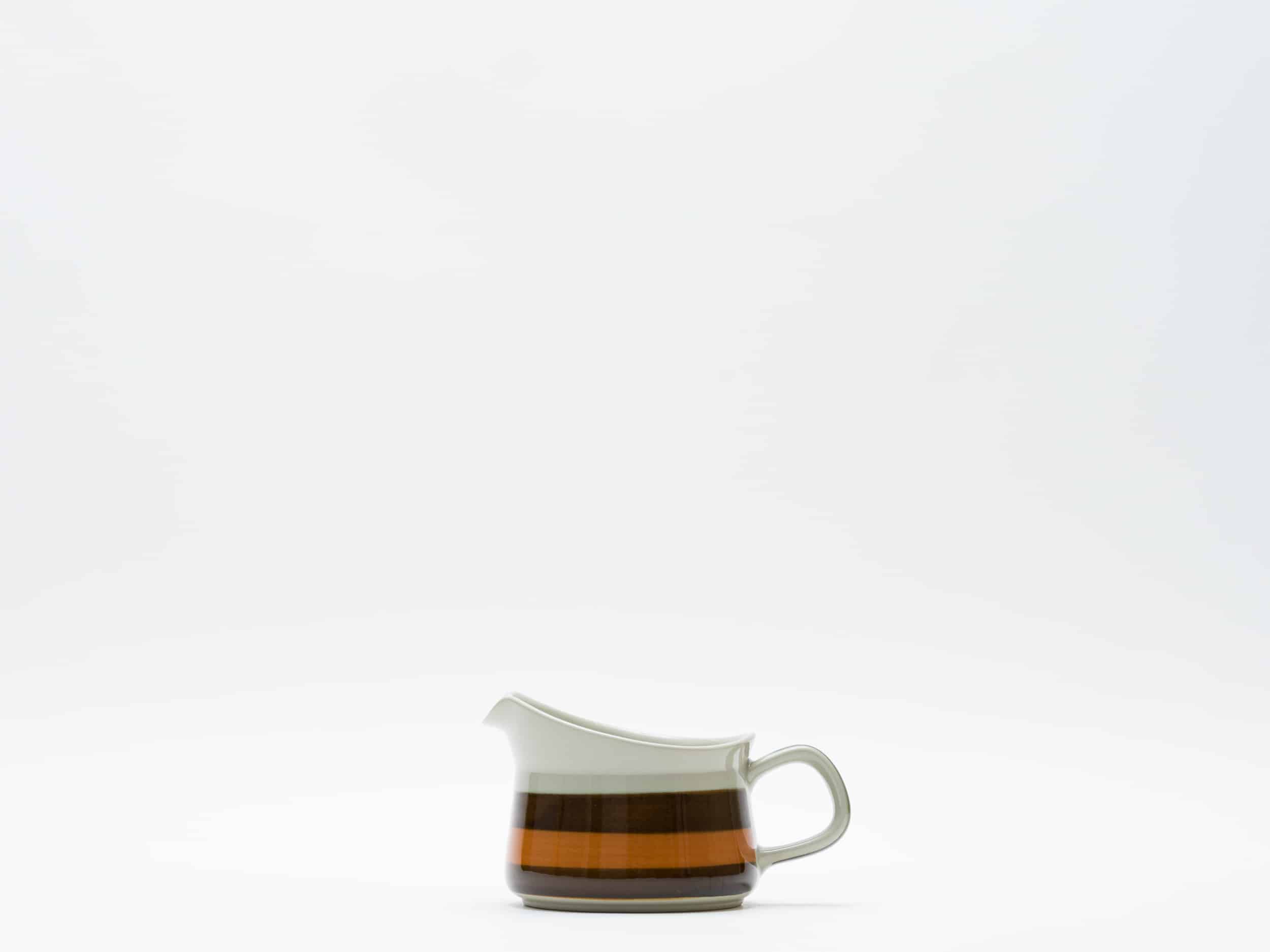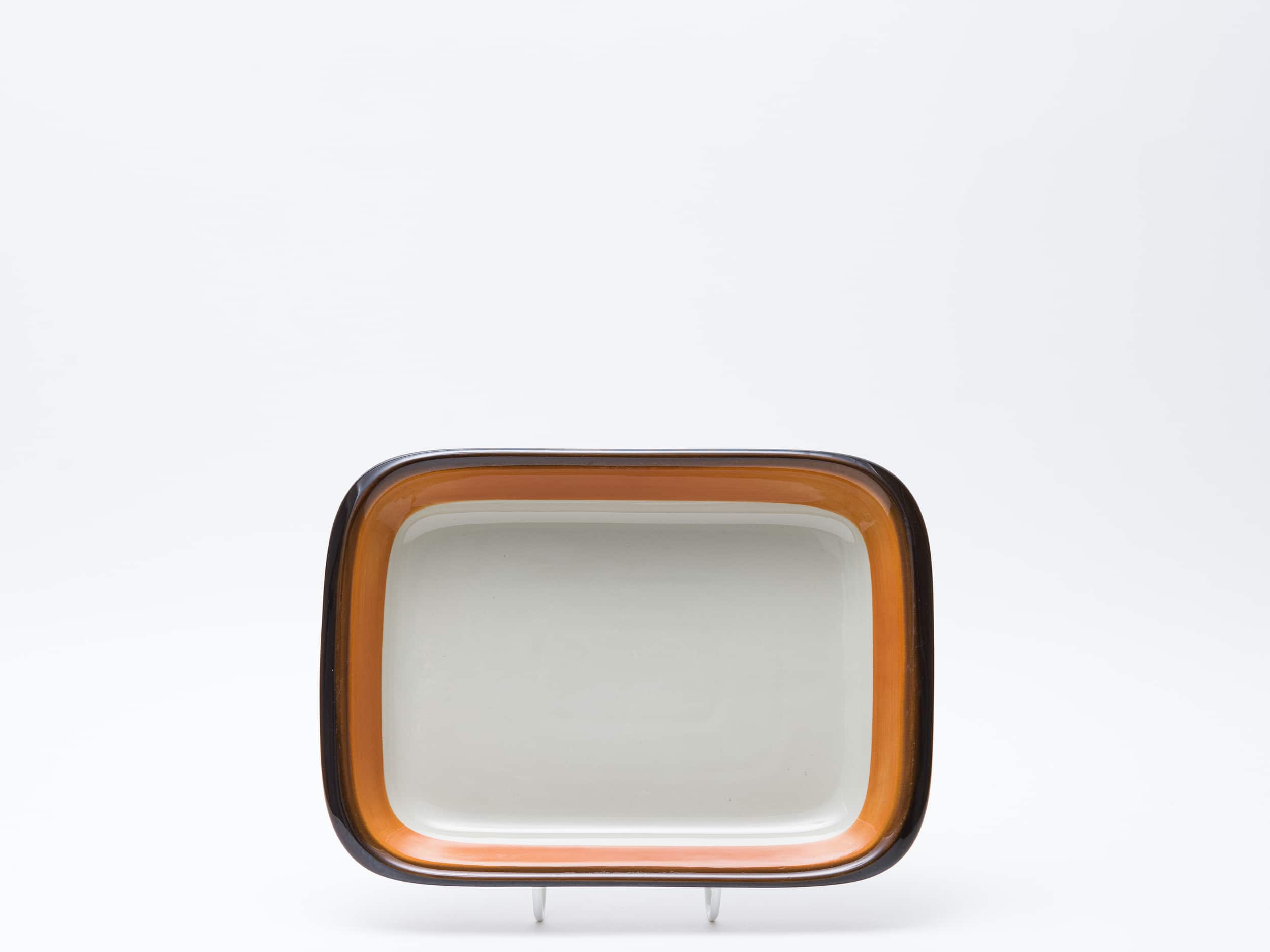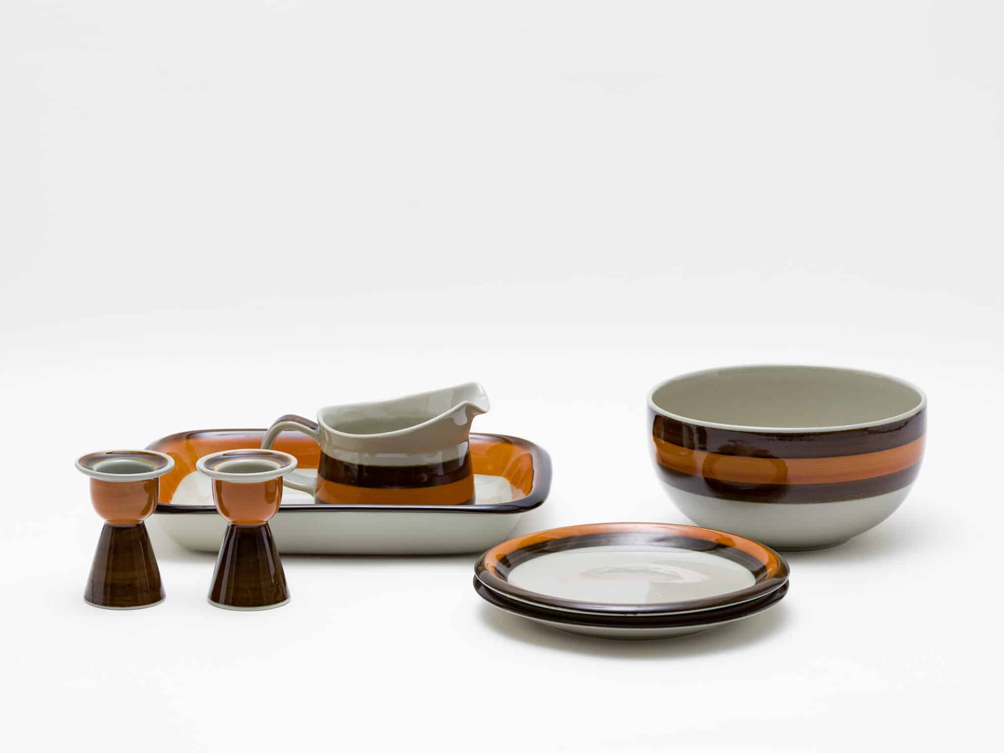 1972年にマリアンヌ・ウェストマンが手がけた《Annika》は、オレンジとブラウンの縁取り模様が印象的な、1970年代らしさを象徴するシリーズです。ざらりとした質感の素地に手描きのラインが重ねられ、素朴で温かみのある表情を見せます。工業製品でありながらクラフト感を残し、日常の食卓に個性と親しみをもたらしたデザインでした。