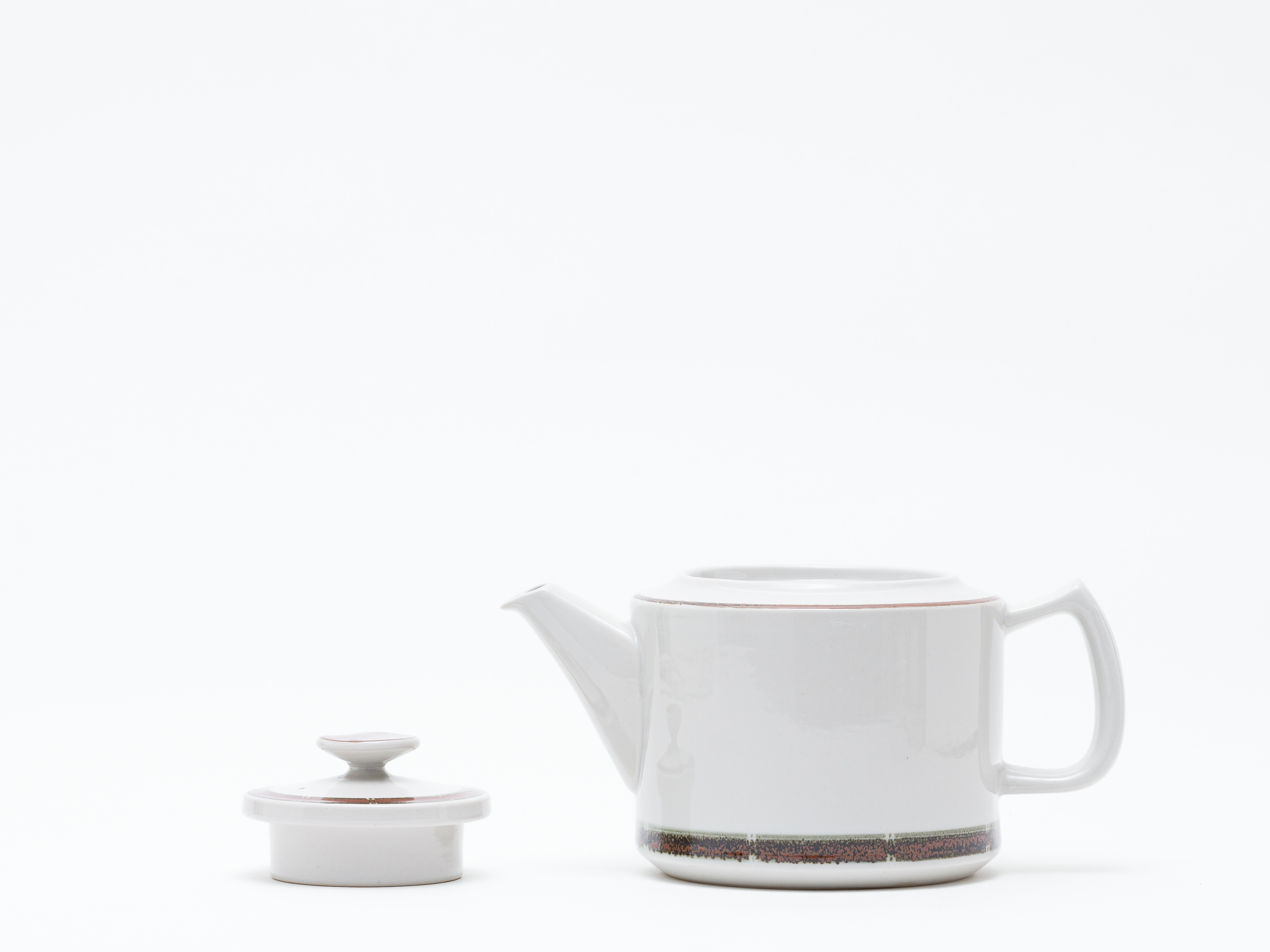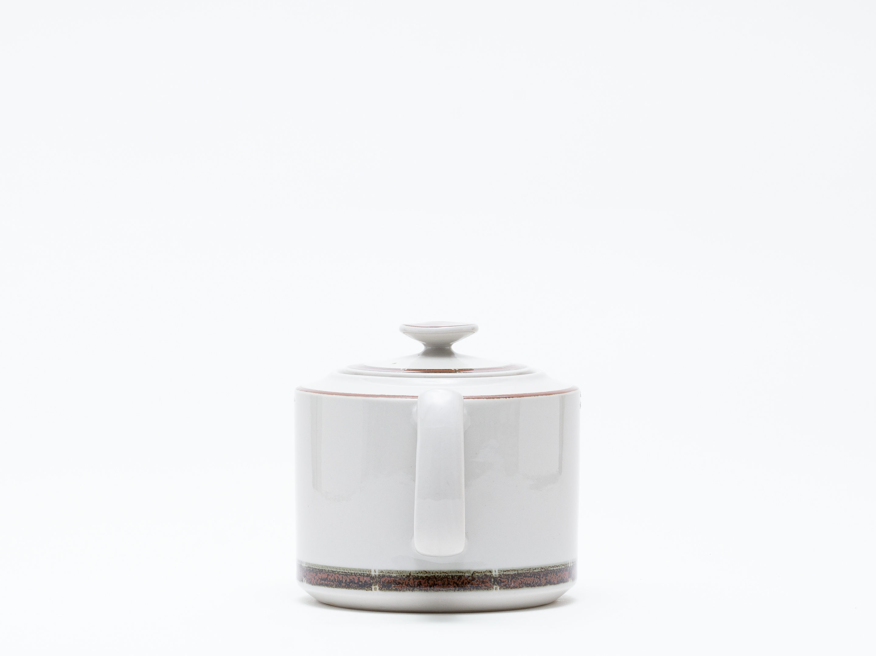 シンプルでモダンなフォルムに、素朴なアースカラーの帯状の模様がアクセント。この装飾は一点一点手描きで施されており、「手描きの炻器 (håndmalet stentøj)」の刻印が、大量生産にはない温かみと個性を与えています。
