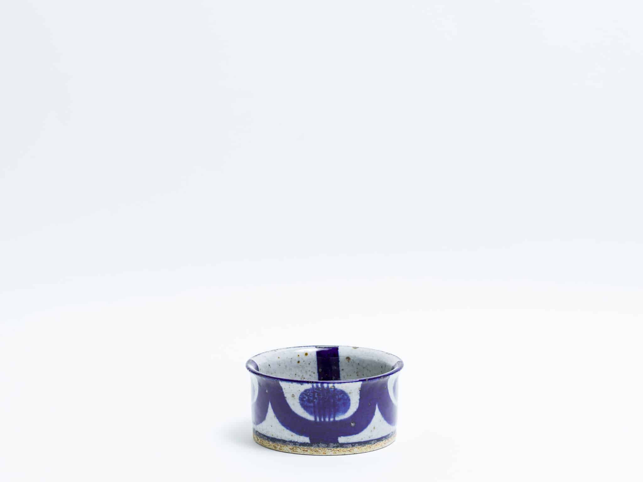 深く沈んだ藍色で繰り返される半円と点描は、リズムを刻むように側面をめぐり、内側には太い十字の筆跡。図案に縛られず、即興のような勢いを残した線が、この器を絵画的な空間に変えています。