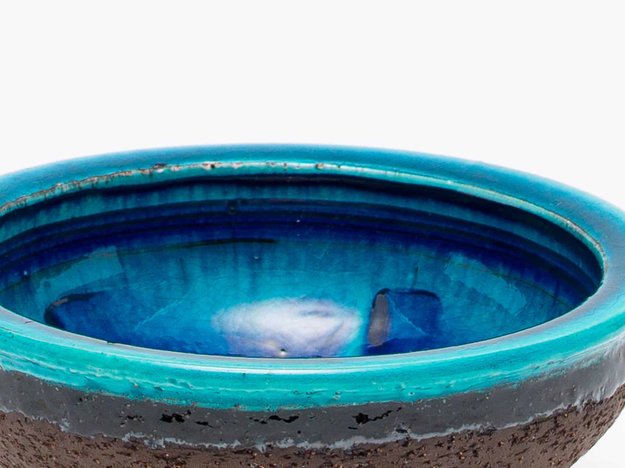 釉薬は、どこかペルシャや中国陶の艶を思わせながらも、粗い素地と組み合わせることで、北欧の静けさに落とし込まれています。光の加減で色が変わり、見る角度によって奥行きが生まれる仕上がりです。器のかたちは低く、真上から青を見下ろせる構成。高台は控えめで、重心の低さが落ち着いた印象をつくっています。焼き締めの素地が釉薬の鮮やかさを引き立て、全体に静かな緊張感を与えています。釉は縁でやや厚く、内側に向かってなだらかに沈みながら自然な濃淡をつくっています。筆の跡は模様というよりも動きとして残り、釉の流れと重なって構造にわずかなリズムを加えています。