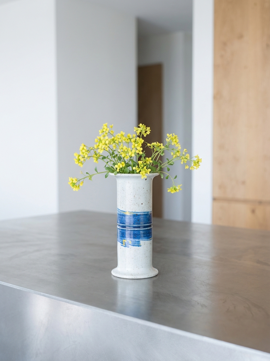 すっと伸びた円筒形のボディに、口縁がゆるやかに開くシルエット。グレーがかった白い釉肌には、細かな斑点が散っていて、まるで星屑をまとったような表情をしています。