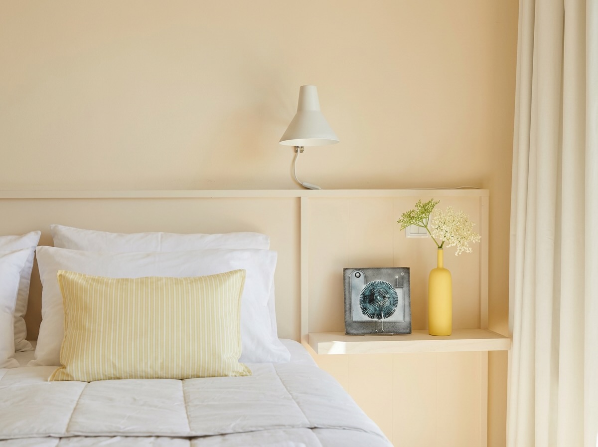 ゆるやかに丸みを帯びた胴体から、細い首がまっすぐに立ち上がる。シンプルを突き詰めたようなフォルムですが、肩の丸みから首への移行には手仕事ならではの微妙な呼吸があり、見ていて飽きません。全体を覆うマットな黄色の釉薬は、温かみがありながらどこか凛としていて、口縁にのぞくわずかな青がさりげないアクセントになっています。
