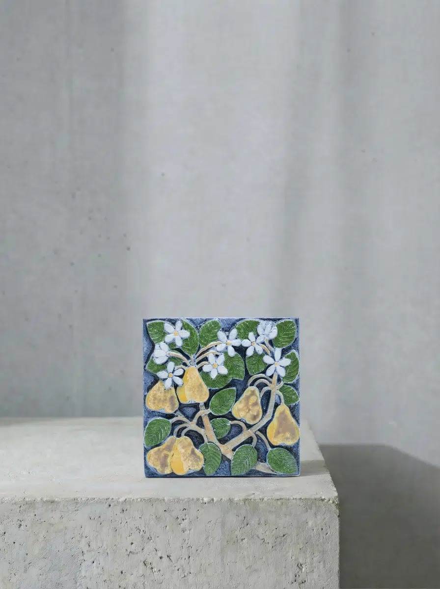 本品は、その量産品と同じ型から生まれたレリーフでありながら、色合いと質感がまるで違います。量産品が白いストーンウェアの上に明るくクリアな色彩を載せるのに対し、この一枚は青みがかった地に深い色調が重なり、全体にどこか翳りのある表情をしています。洋梨の黄色は褐色がにじんでまだら模様を描き、花弁の白には細かな貫入が走り、枝を描く線には筆の勢いがそのまま残っています。