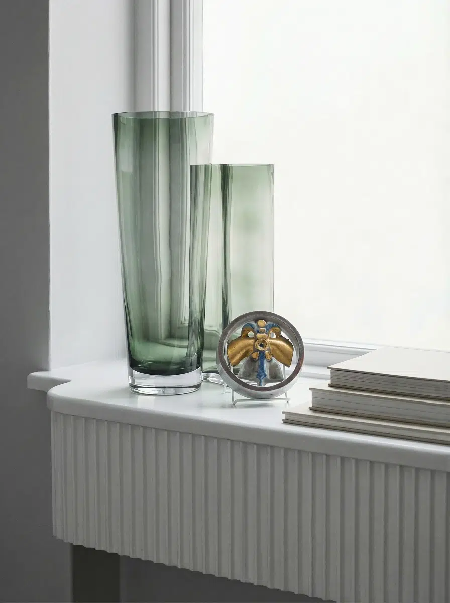 量産品のFjärilが水色と黒と赤で明快に語りかけてくる蝶だとすれば、この試作品は、金とラベンダーの中で静かにたたずむ蝶。同じ形でありながら、色彩が作品の性格をここまで変える——その事実自体が、釉薬テストという工程の意味を雄弁に物語っています。