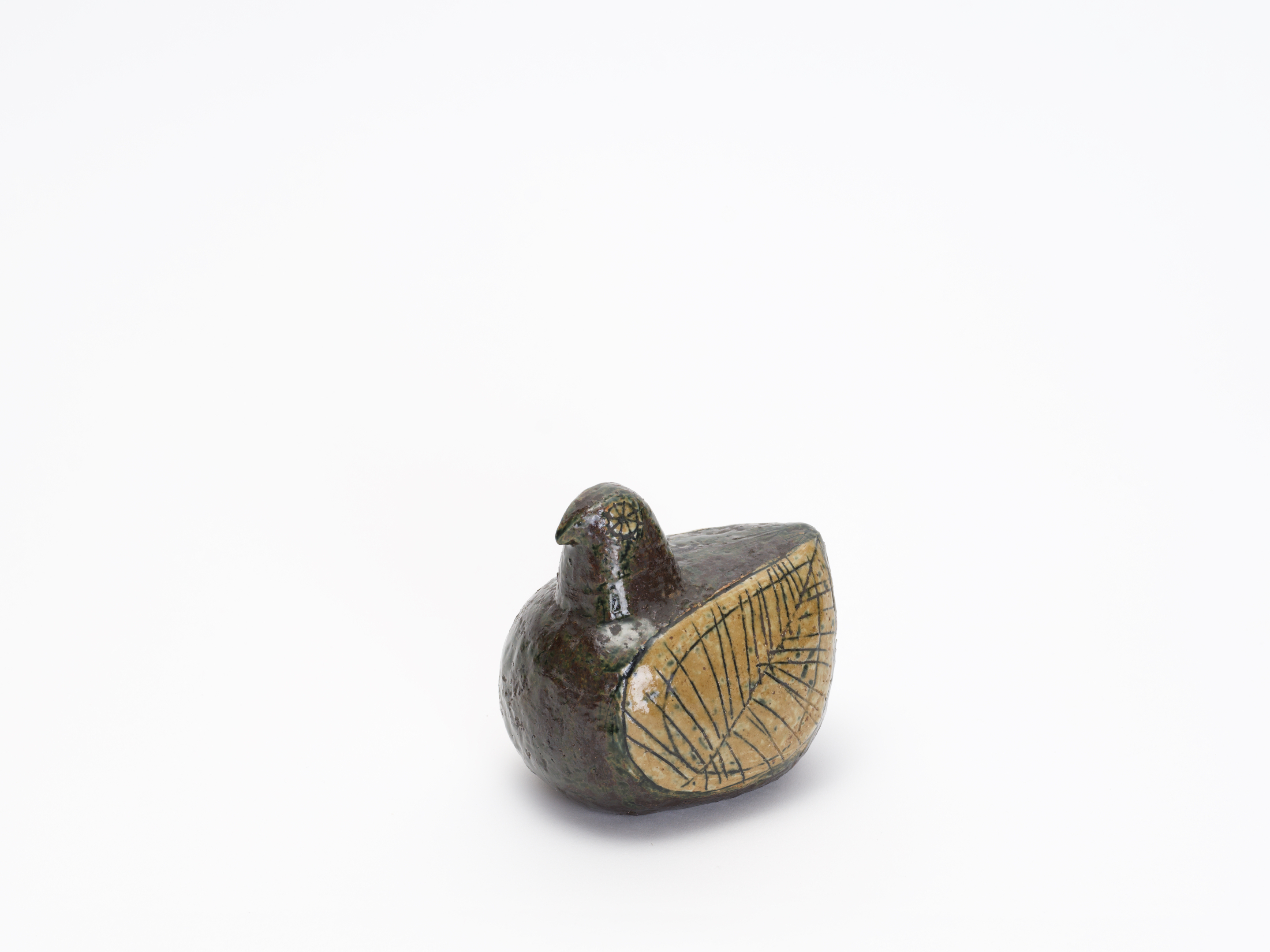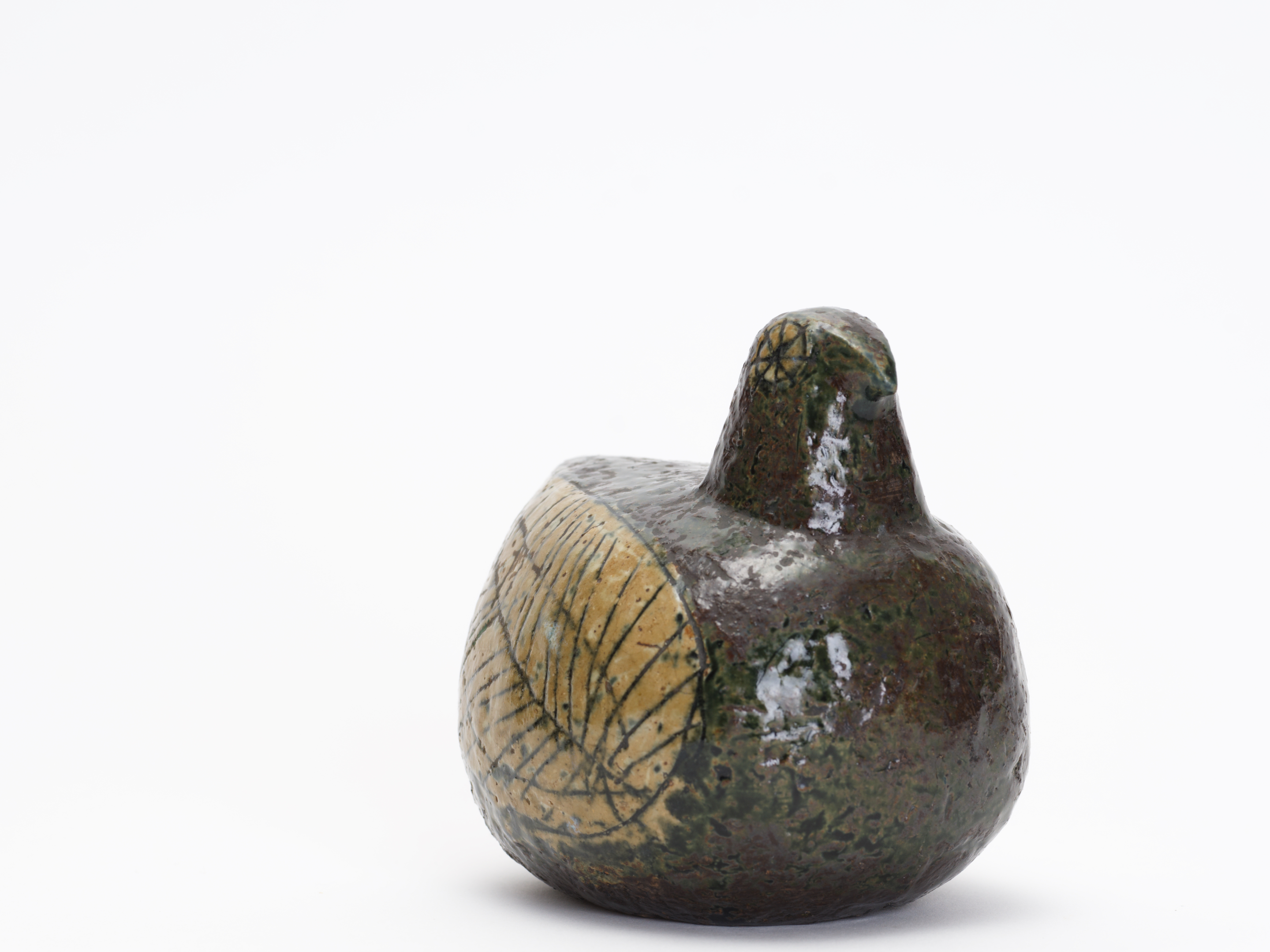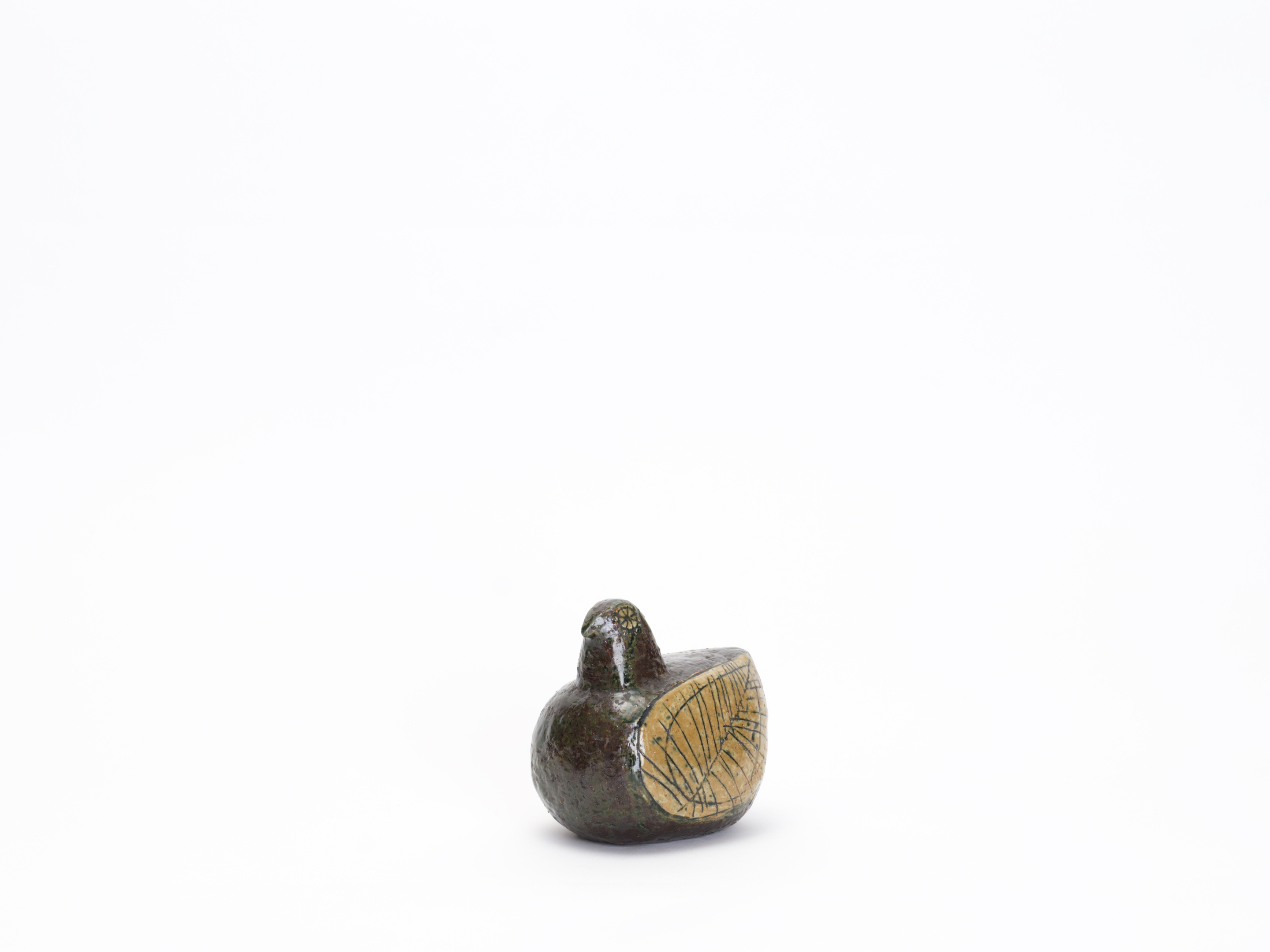 24歳のリサがグスタフスベリの試用期間中に手がけた、まさにキャリアの原点。この個体は、その量産品Palomaが生まれる前に、リサ自身がスタジオで手びねりした一点物のスタジオ作品と考えられます。ころんと丸い胴体、ちょこんと載った小さな頭——Palomaに通じるフォルムの骨格がはっきりと見てとれますが、その全身を覆う深いオリーブグリーンから褐色の釉薬、翼に施された葉脈のように細密な線刻装飾、そして花のような丸い目の表現は、白い素地にカラフルな手描きを施した量産品とはまったく別の世界に属しています。RETRO社のLisa Larson特集号(P.96)にも同様の作品が掲載されています。