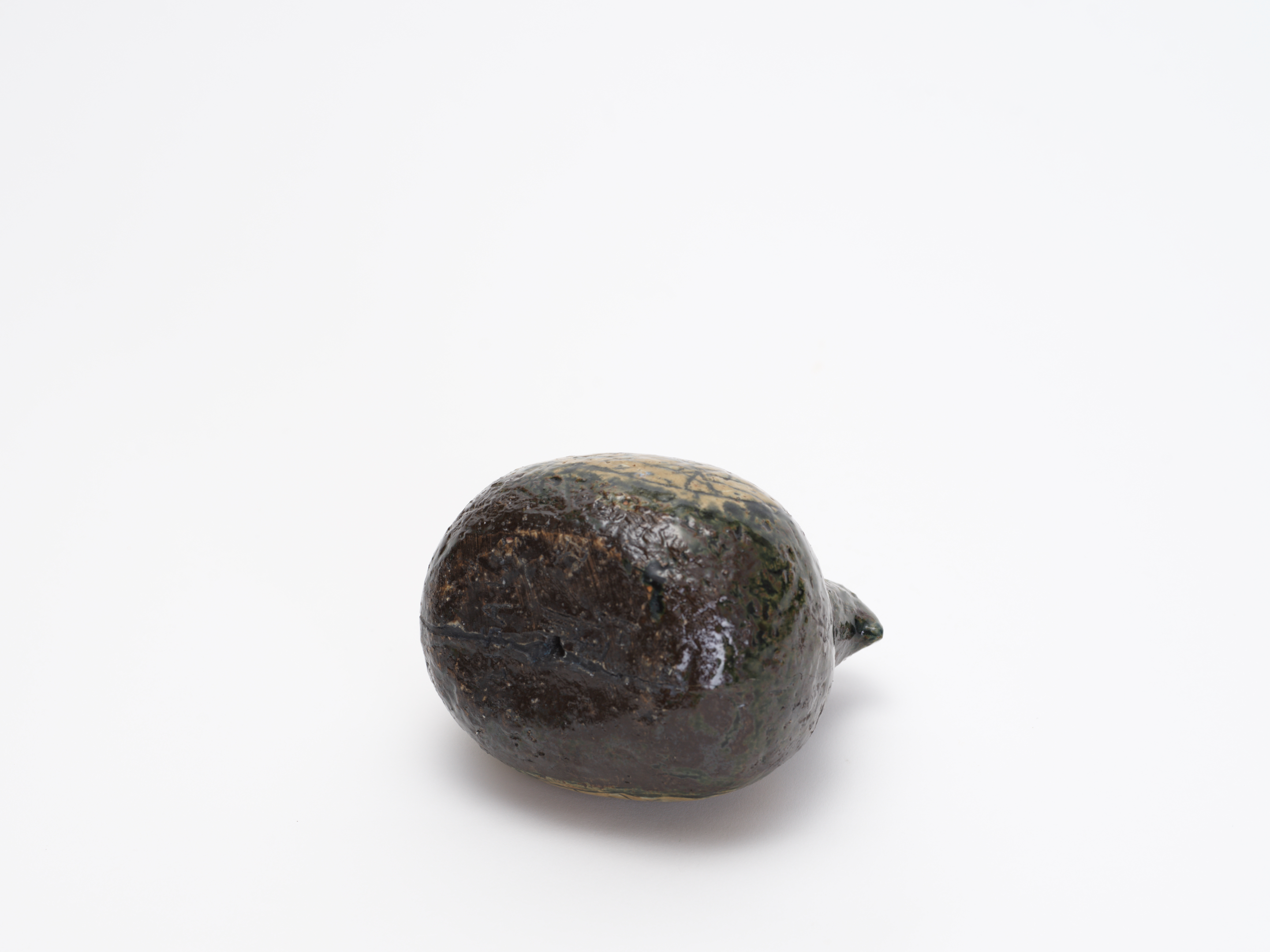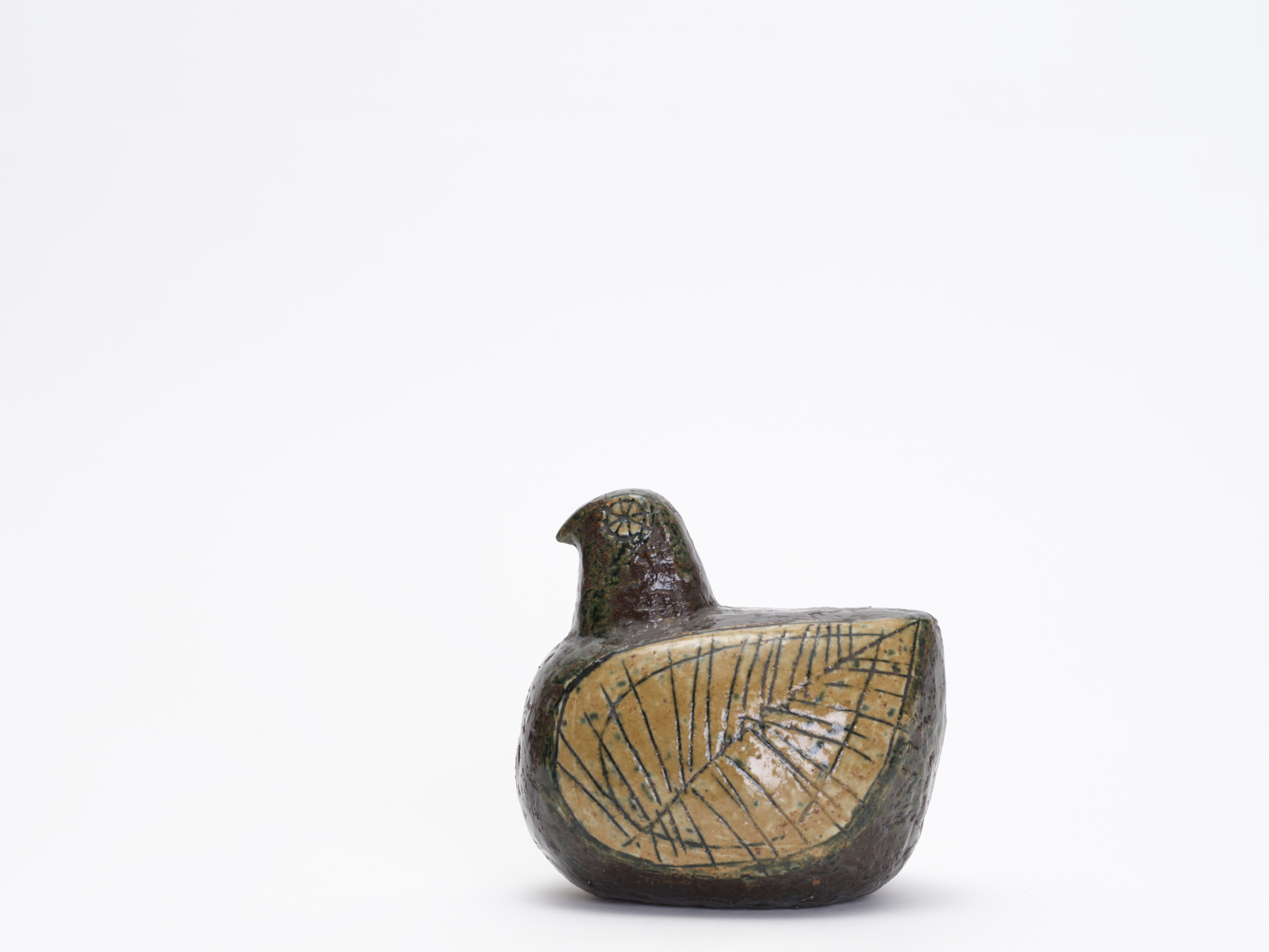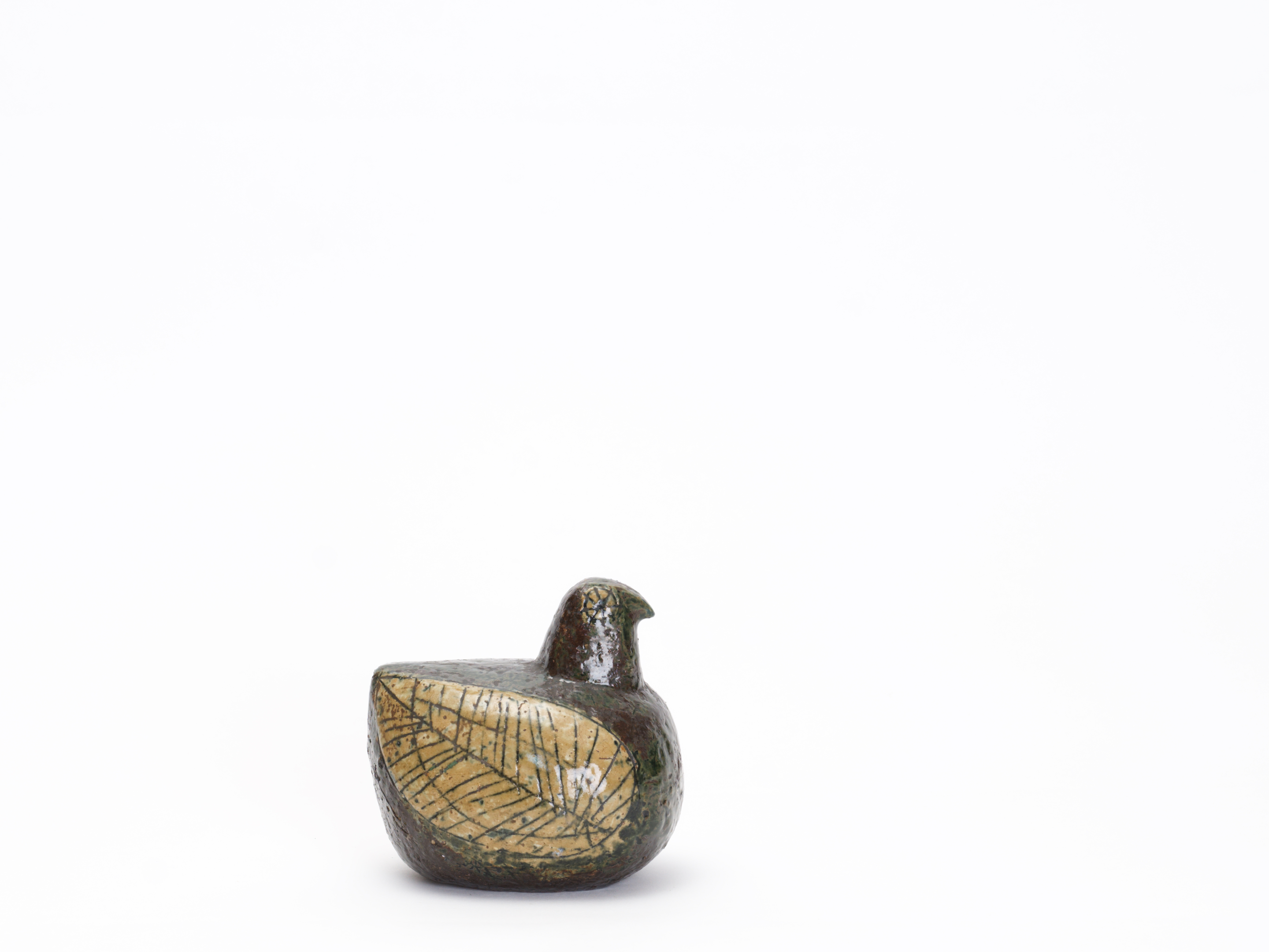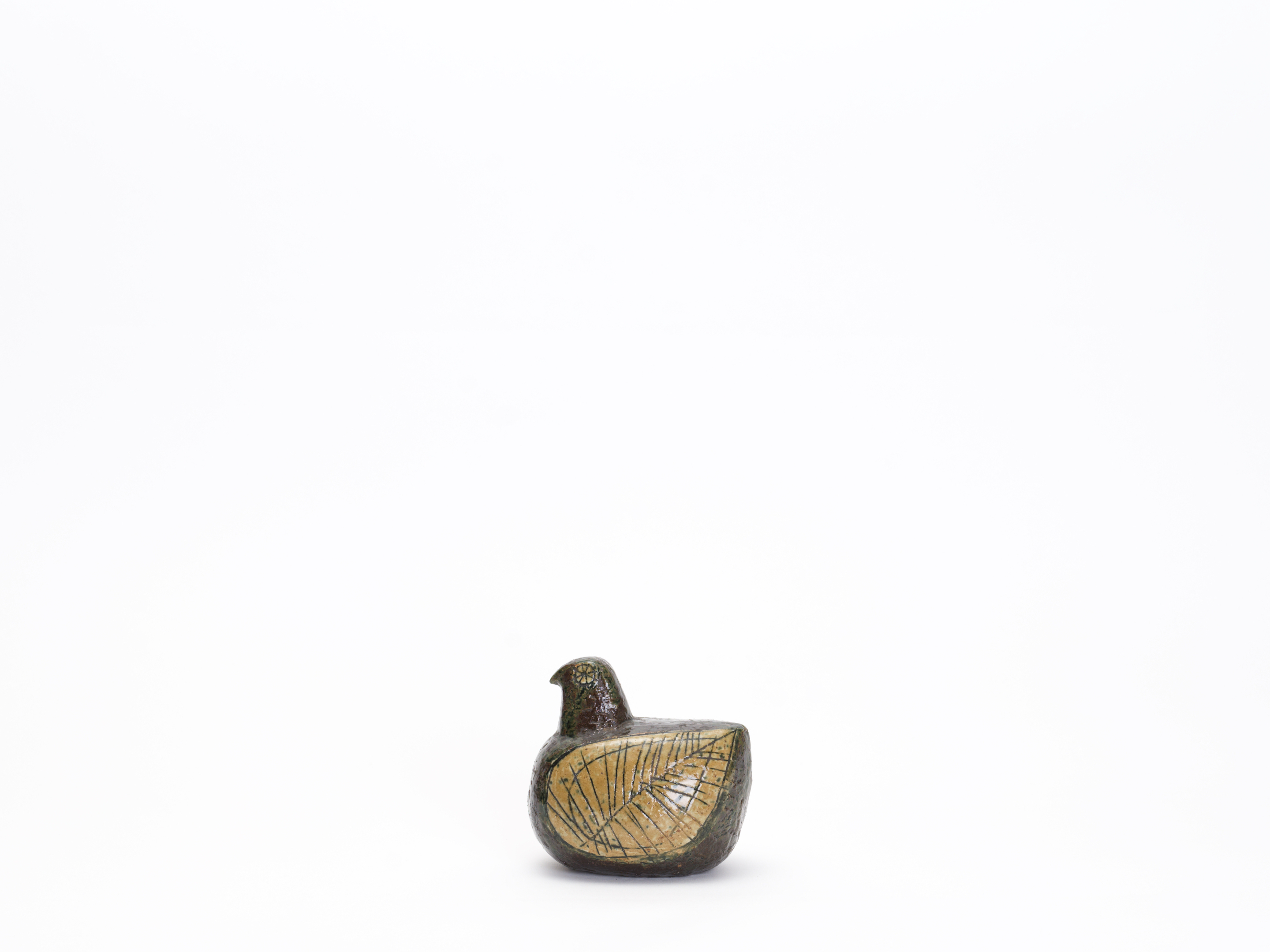 24歳のリサがグスタフスベリの試用期間中に手がけた、まさにキャリアの原点。この個体は、その量産品Palomaが生まれる前に、リサ自身がスタジオで手びねりした一点物のスタジオ作品と考えられます。ころんと丸い胴体、ちょこんと載った小さな頭——Palomaに通じるフォルムの骨格がはっきりと見てとれますが、その全身を覆う深いオリーブグリーンから褐色の釉薬、翼に施された葉脈のように細密な線刻装飾、そして花のような丸い目の表現は、白い素地にカラフルな手描きを施した量産品とはまったく別の世界に属しています。RETRO社のLisa Larson特集号(P.96)にも同様の作品が掲載されています。