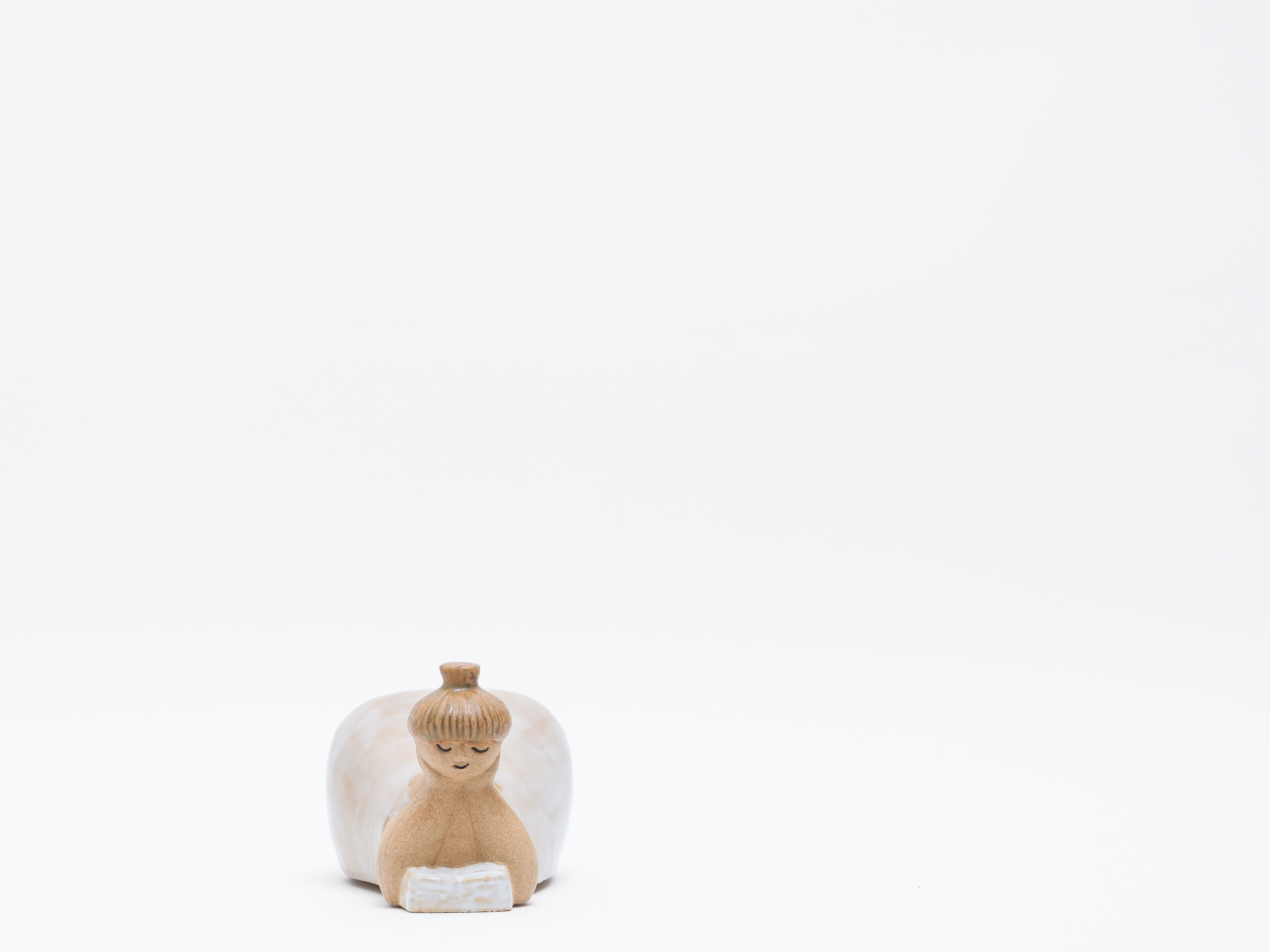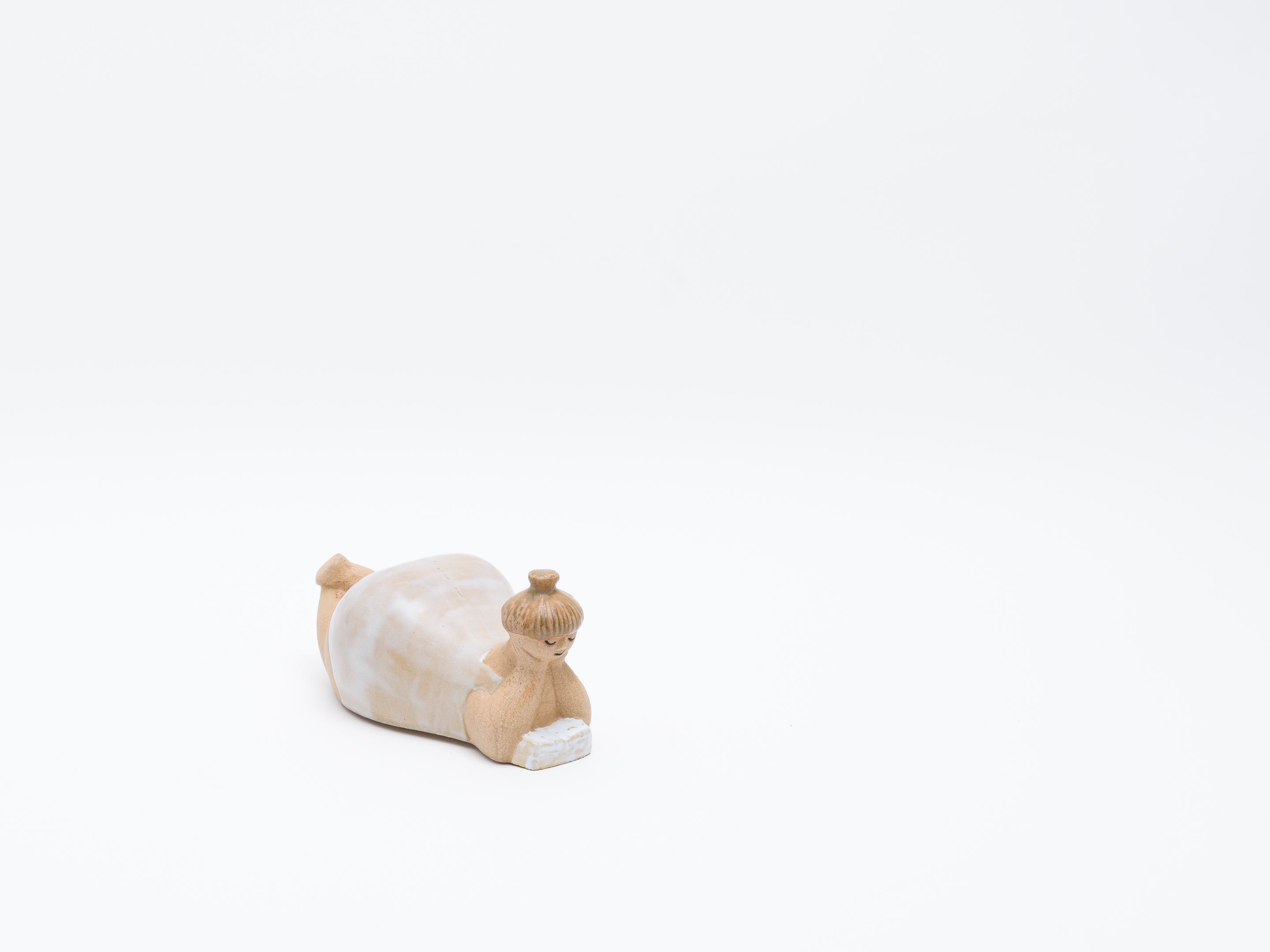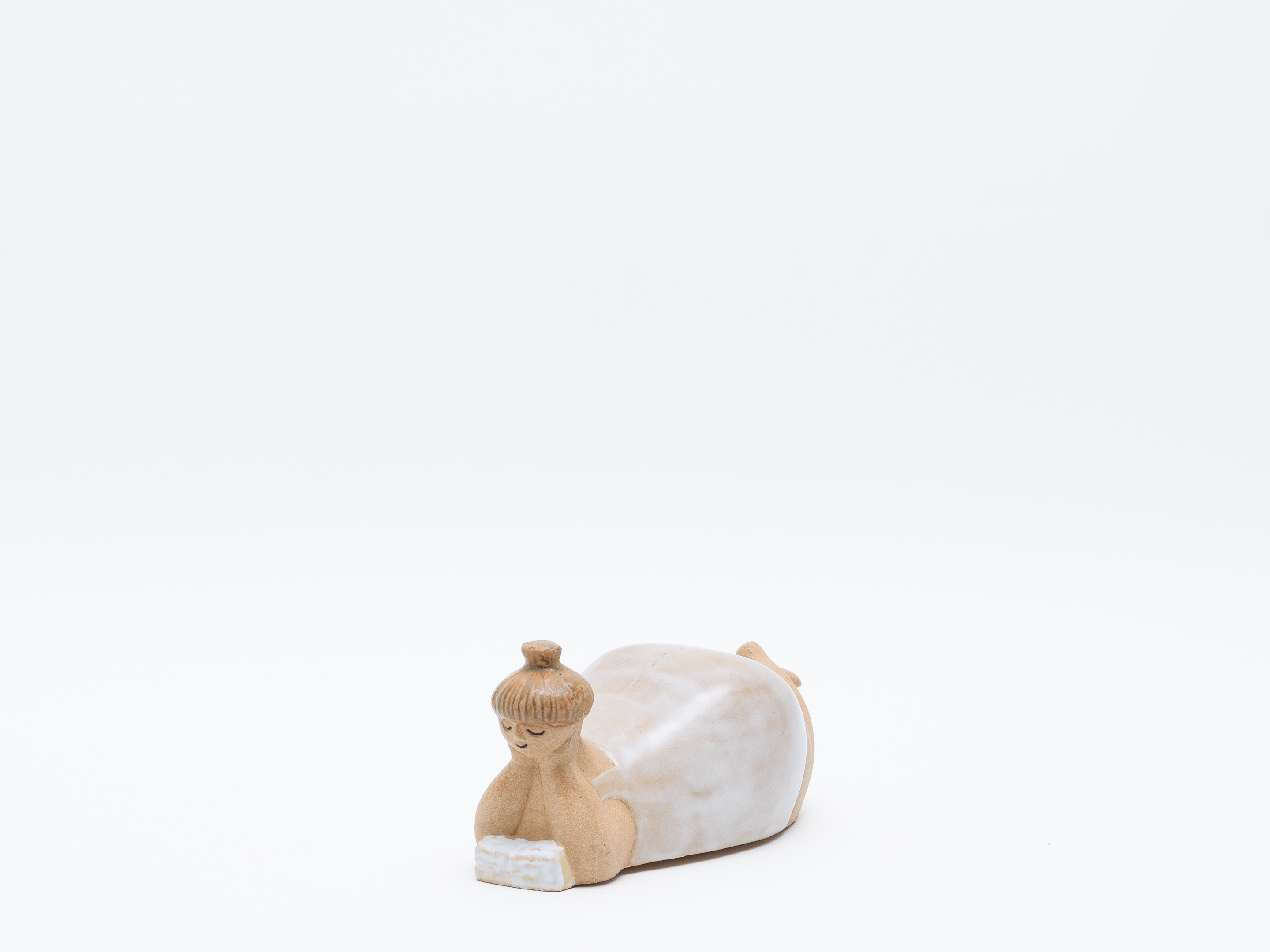 Beataは、うつ伏せに寝そべり、両肘をついて本を広げている女の子です。おだんご頭をちょこんと持ち上げ、足先をぴょこっと跳ね上げて、まるで日曜の午後をまるごと独り占めしているかのよう。姉妹たちのなかでもひときわ自由気ままな空気をまとった一体で、ゆったりと弧を描く背中からお尻にかけてのラインには、リサが生涯愛し続けた豊かな丸みへの賛歌が詰まっています。
