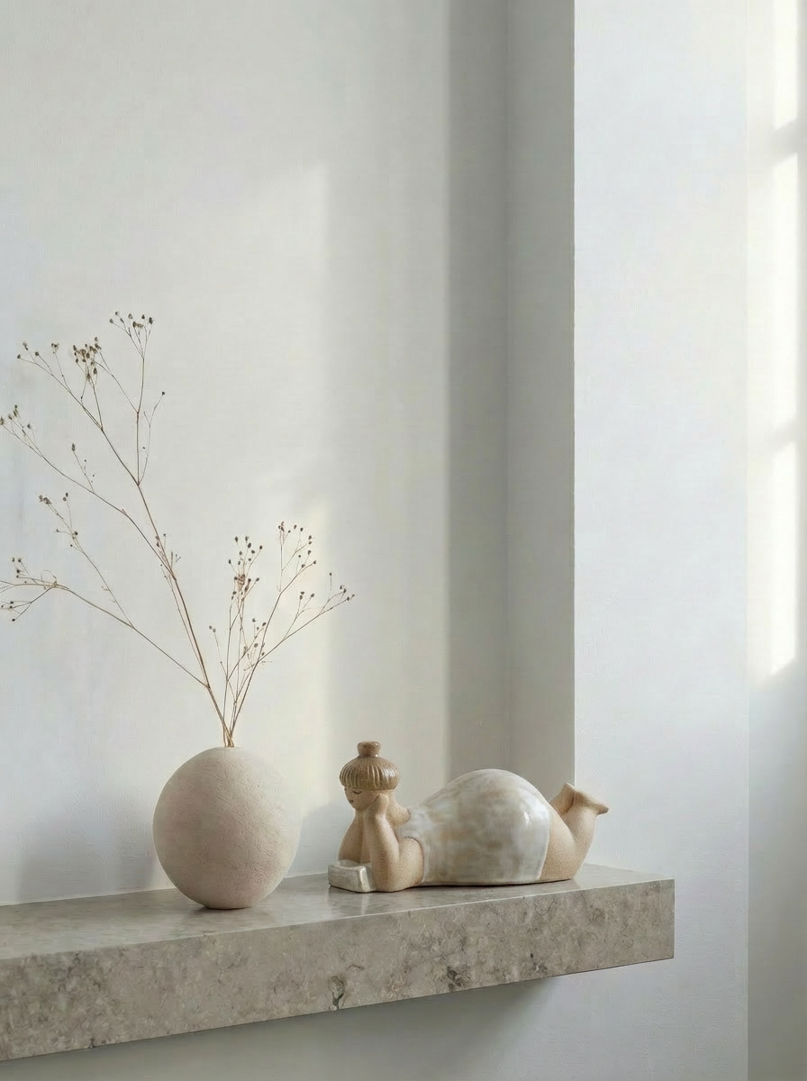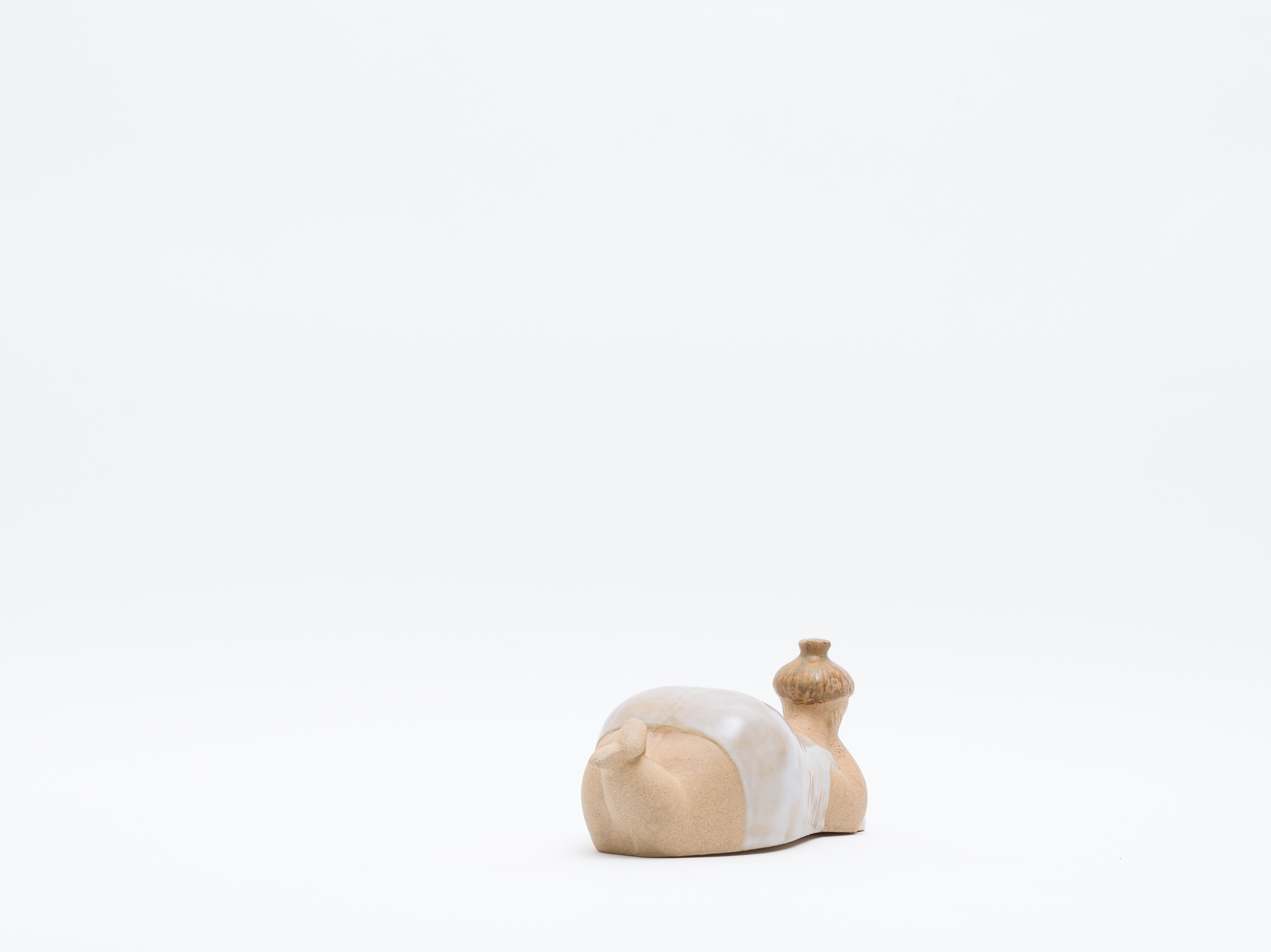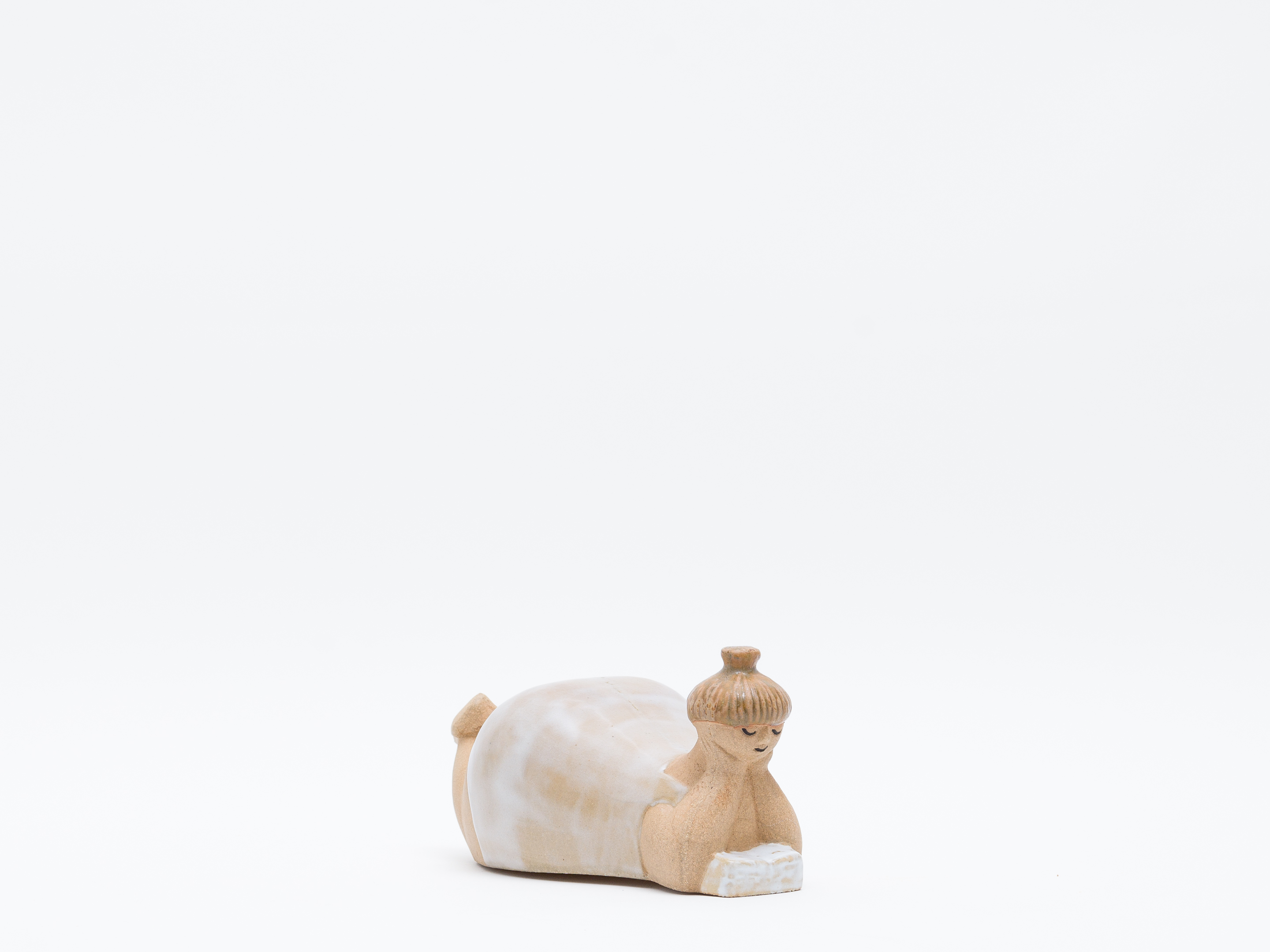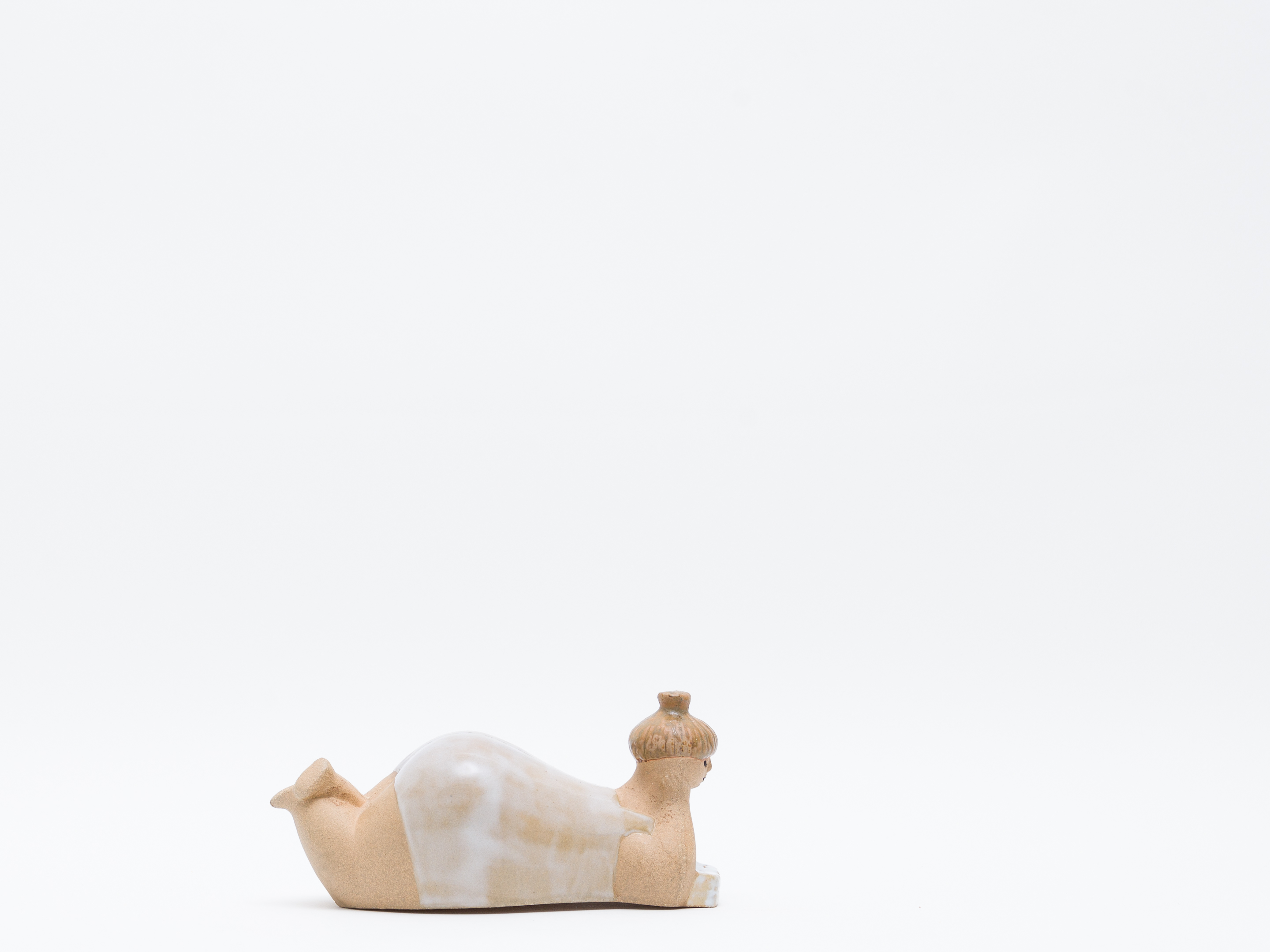 Beataは、うつ伏せに寝そべり、両肘をついて本を広げている女の子です。おだんご頭をちょこんと持ち上げ、足先をぴょこっと跳ね上げて、まるで日曜の午後をまるごと独り占めしているかのよう。姉妹たちのなかでもひときわ自由気ままな空気をまとった一体で、ゆったりと弧を描く背中からお尻にかけてのラインには、リサが生涯愛し続けた豊かな丸みへの賛歌が詰まっています。