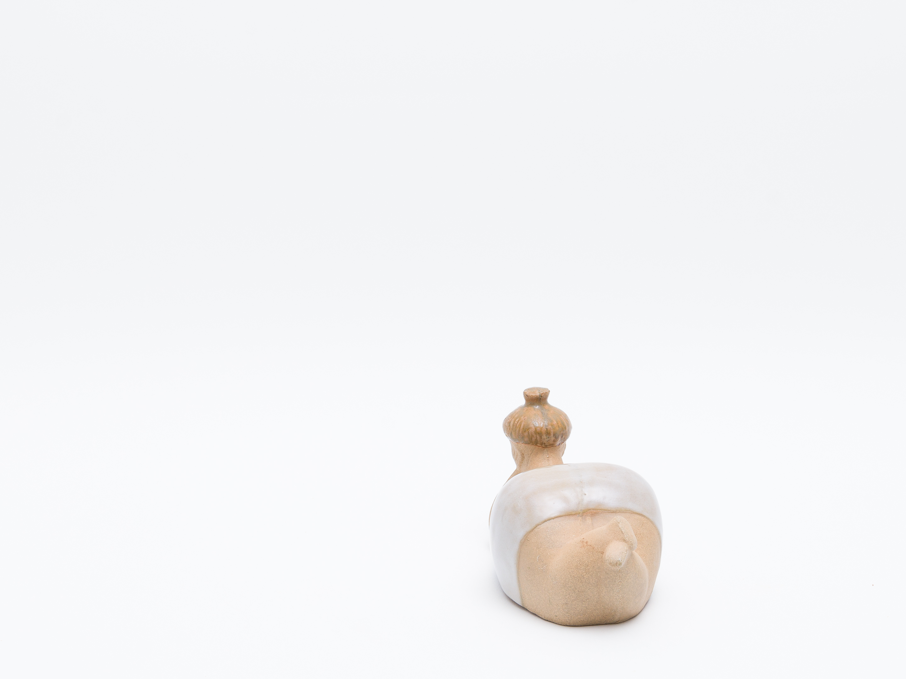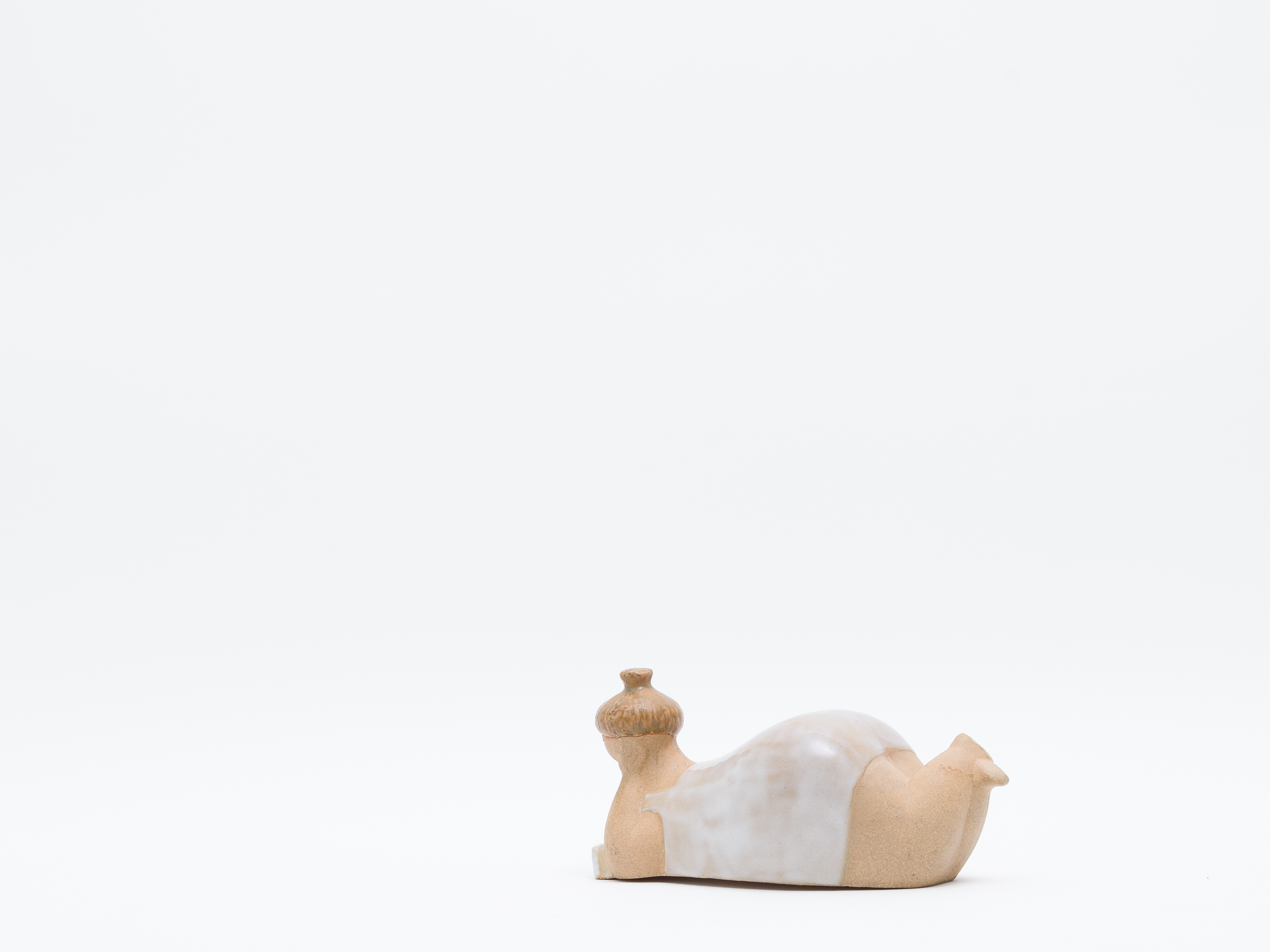 量産品のBeataは、ドレス部分に鮮やかで均一な釉薬が施されています。対して本品は、白釉に淡い黄みやムラがあり、素地の土色がところどころ透けて見えています。釉薬と素地の境界も、量産品ほどきれいに塗り分けられていません。完成品としての美しさではなく、釉薬がこの土の上でどう振る舞うかを見るための焼成だったことが、表面から読み取れます。