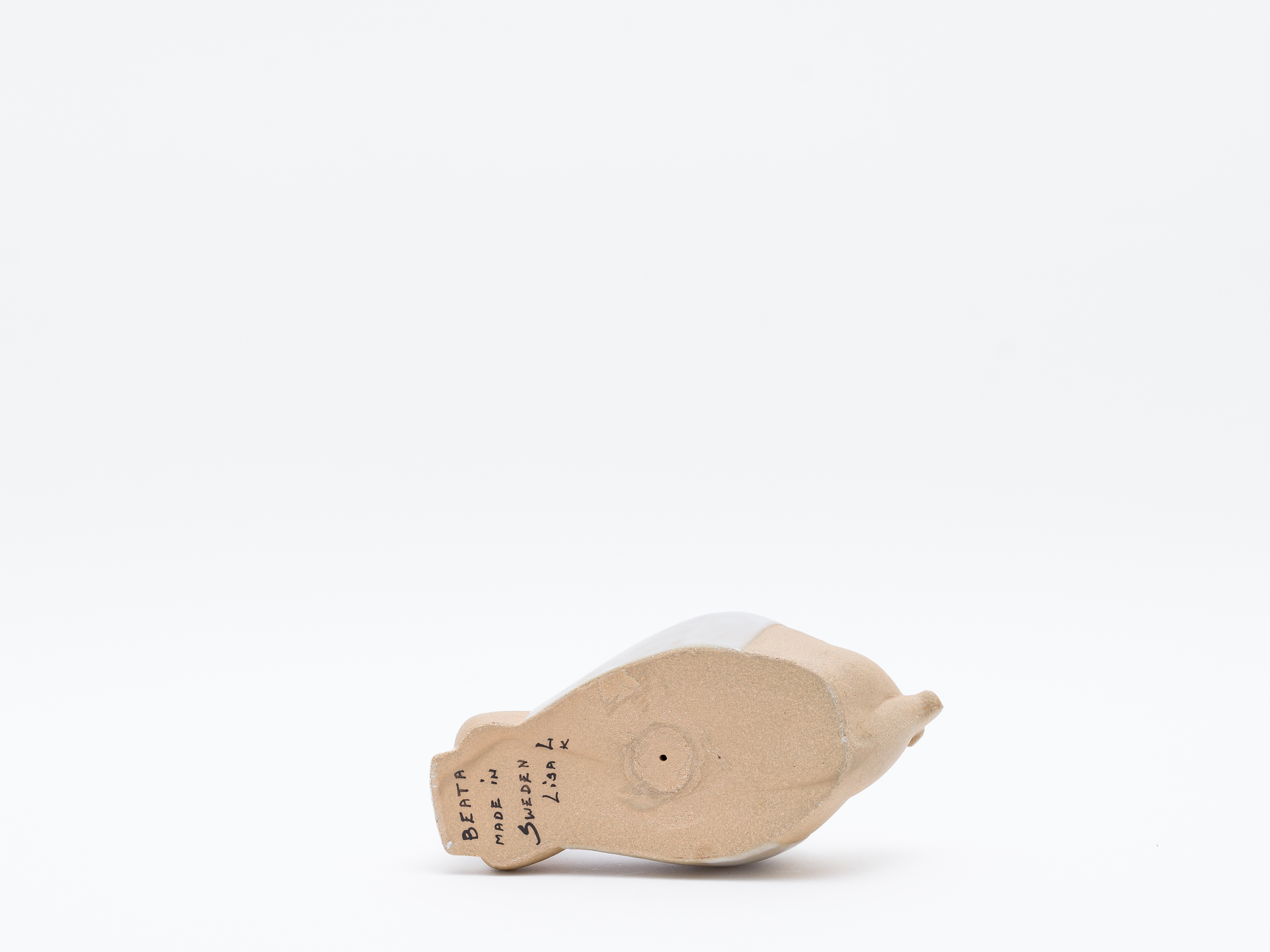 グスタフスベリでは、リサが粘土の原型を手で作り、それが認められると工場の職人たちが石膏型を起こして量産へと移行しました。その過程で、釉薬研究室が実際のフィギュアの形に釉薬を施し、窯で焼いて発色を確かめます。本品はまさにその段階で生まれたものと考えられます。