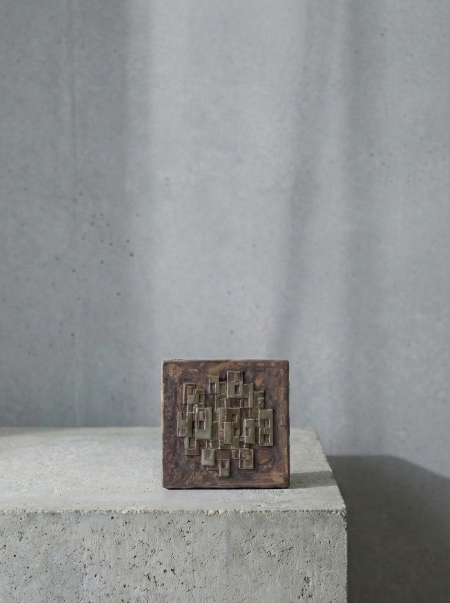 Stig Carlsson(スティグ・カールソン)自身の手による立体的な陶板作品です。”Staden=都市”というタイトルのこの作品、都市化の進展と技術革新の波を、陶芸という伝統的な媒体を用いて表現しています。重ね合わされた幾何学的なパターンは、都市の持つ重層的な特性と、時には秩序と混沌の間で揺れ動く都市生活のリアリティを象徴しています。世界中で多くの変革が起こった1980年代の文化的・社会的な背景を反映しながら、新しい普遍的な都市のイメージを創り上げた作品といえます。