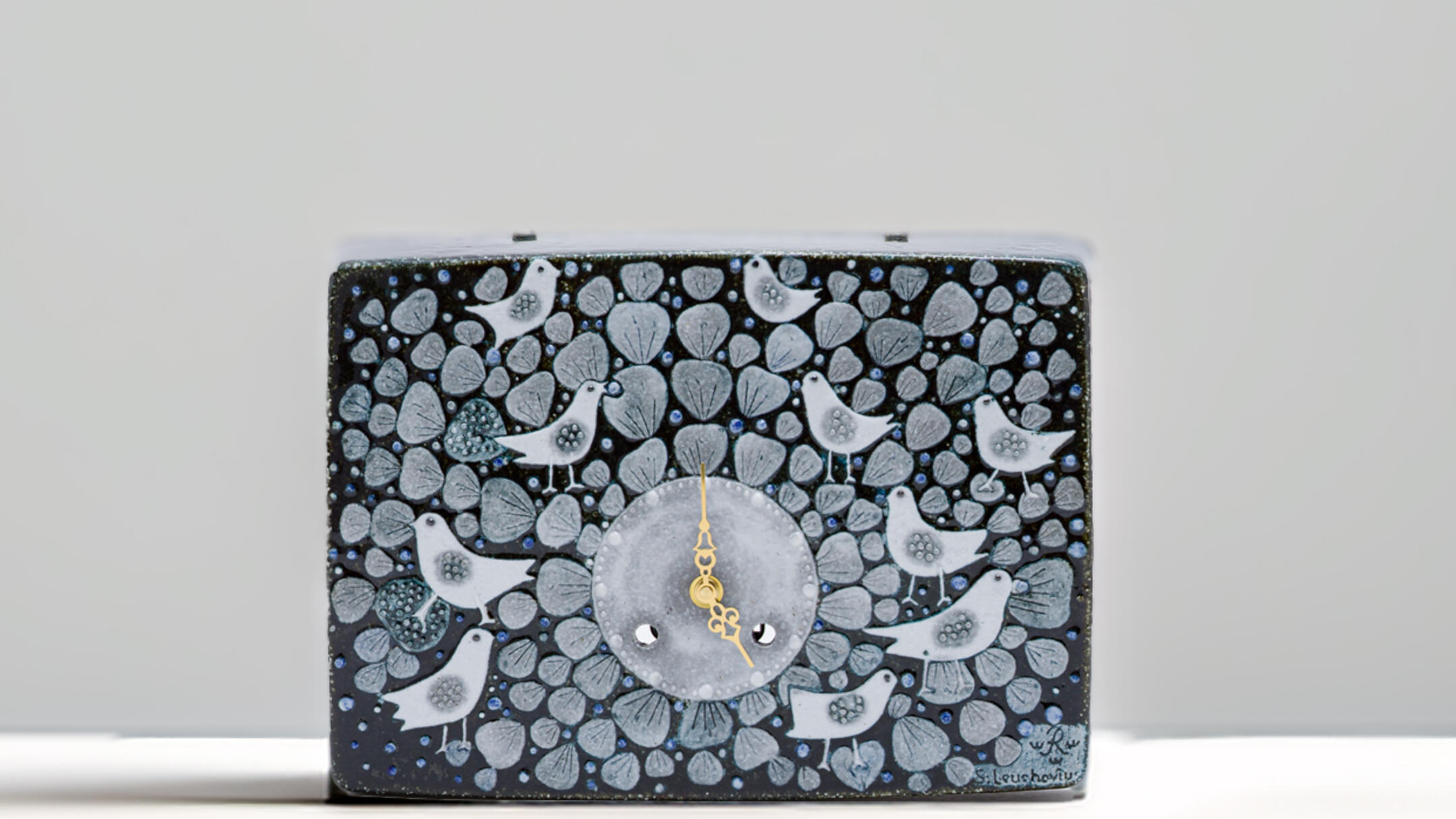 ── 人気の鳥モチーフが全面に描かれた、シルヴィア・レウショヴィウスによる陶製時計。試作段階の一点もので、量産品にはない質感と色の深みが宿ります。