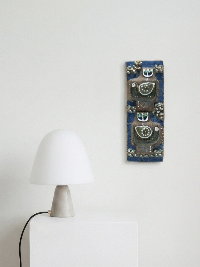 スウェーデン中部ダーラナ地方のNittsjö窯で、約半世紀にわたりデザイナー兼技術者として活躍したトーマス・ヘルストローム。動物フィギュアの名手として知られる彼が手がけた、鳥と花のモチーフの壁掛けレリーフです。