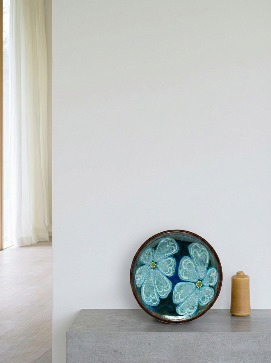 トーマスは「温かみがあり、ユーモラスで、時にさりげない皮肉を込める」北欧の伝統を受け継ぐ作り手でした。この花の大胆な筆致にも、どこかそんな茶目っ気が漂っています。