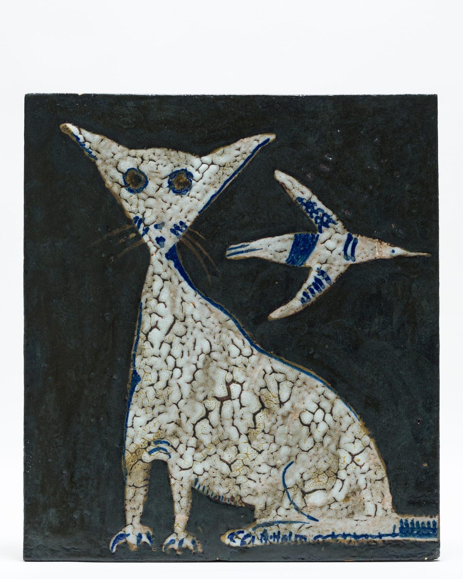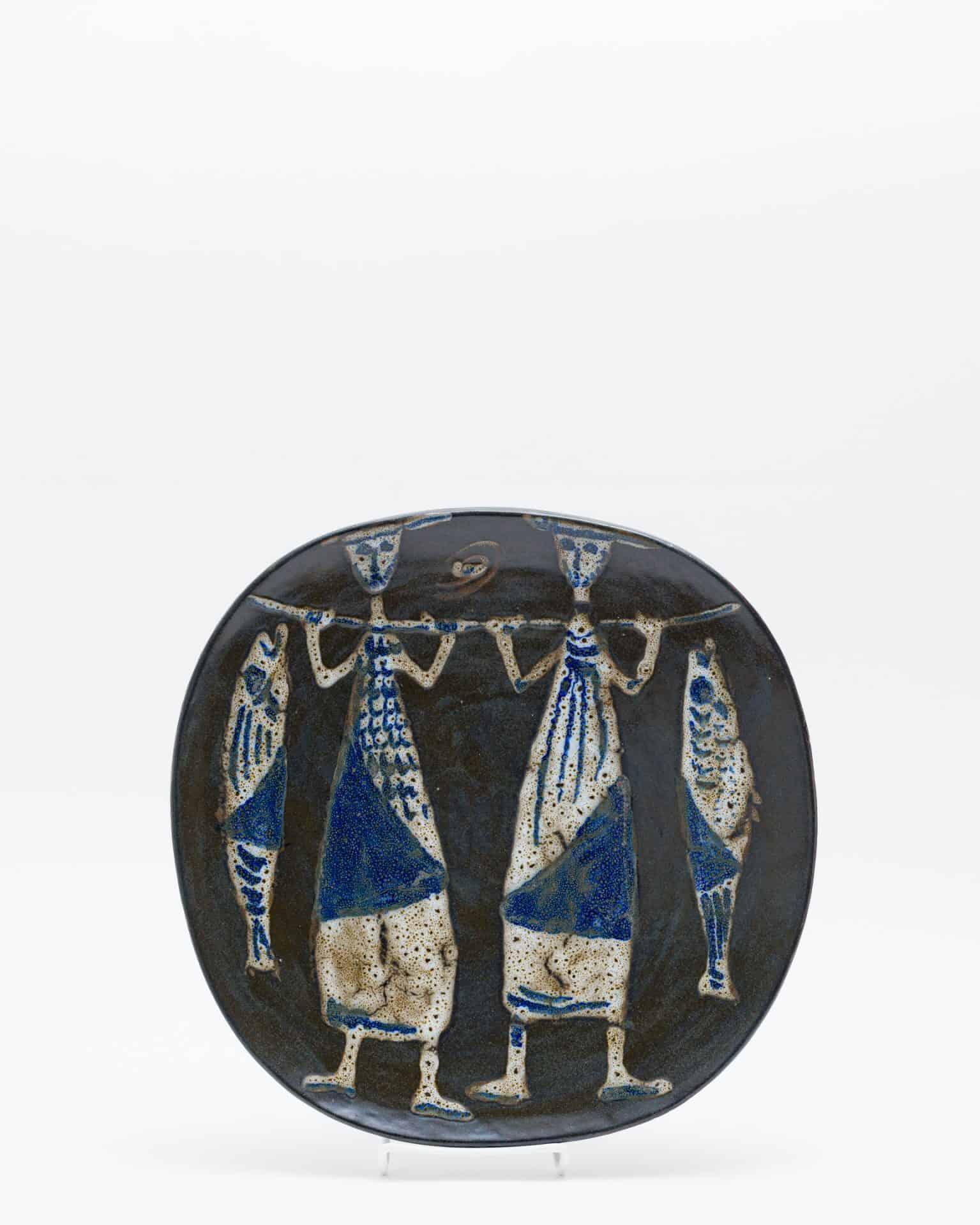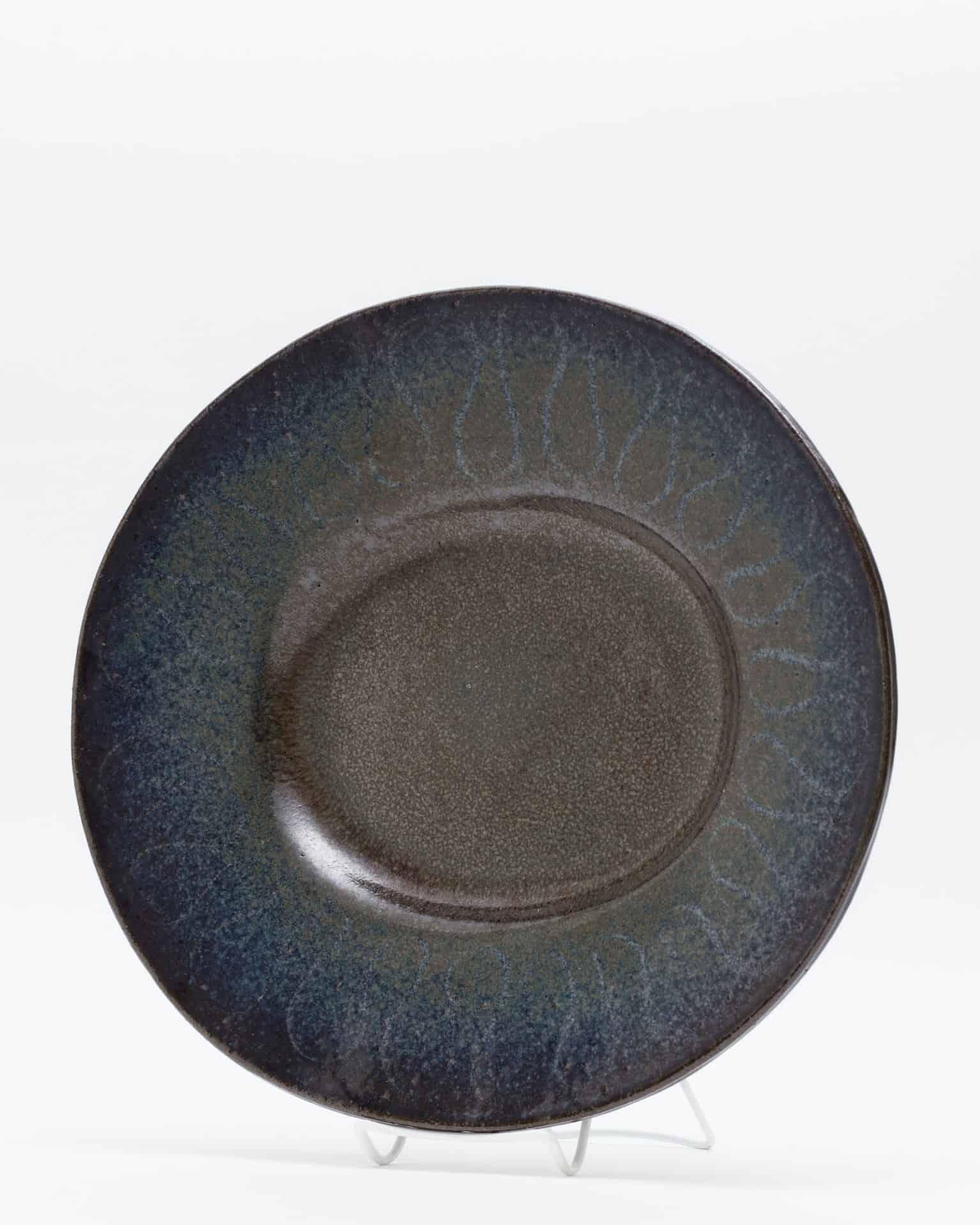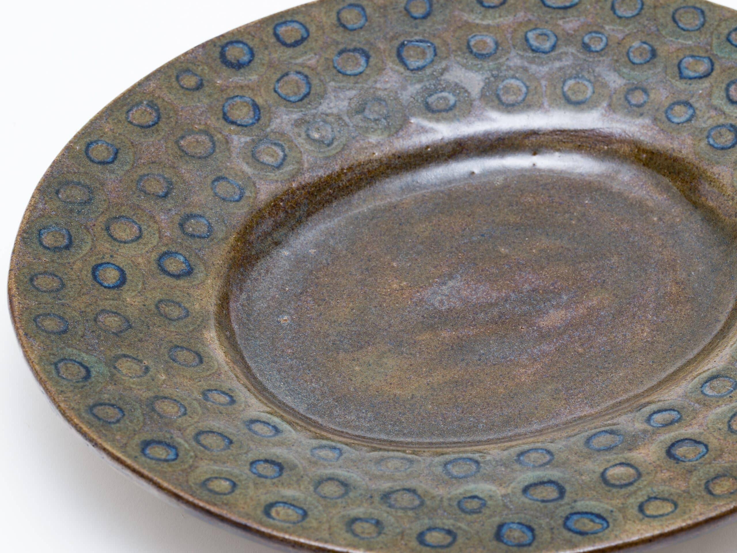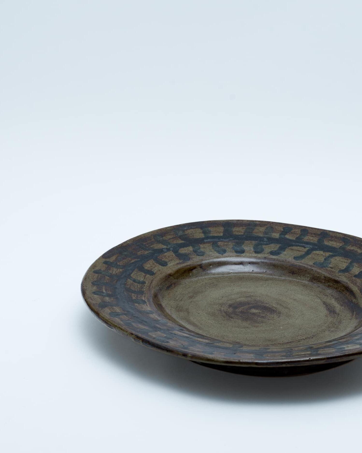 - 石膏の丘から生まれる大皿ろくろをあまり好まなかったホルムは、彼を象徴する大皿を独自の方法で生み出しました。それは、タタラ作りした大きな粘土の板を、ドーム状の「石膏の丘」にかぶせて成形するという手法です。これにより、正円ではない、生命感のある歪みを持ったフォルムが可能になりました。装飾は、乾いた粘土の上に、水分をたっぷり含んだ筆で大胆に描かれました 。そのモダンな作風には、南仏で陶芸に打ち込んだピカソからの影響も見て取れます。一枚一枚が、彼の絵画的な才能と造形感覚が凝縮された、唯一無二の作品なのです。