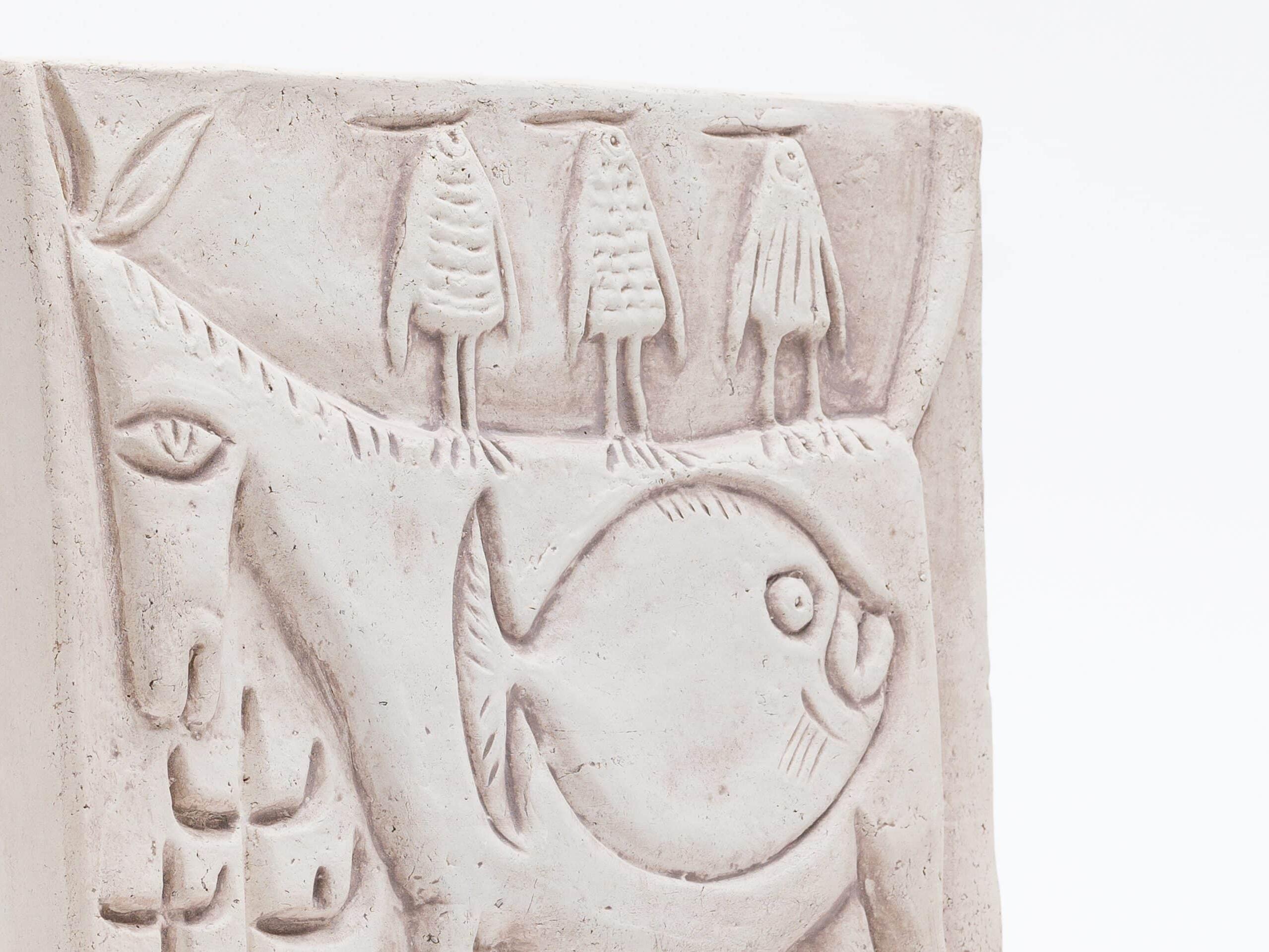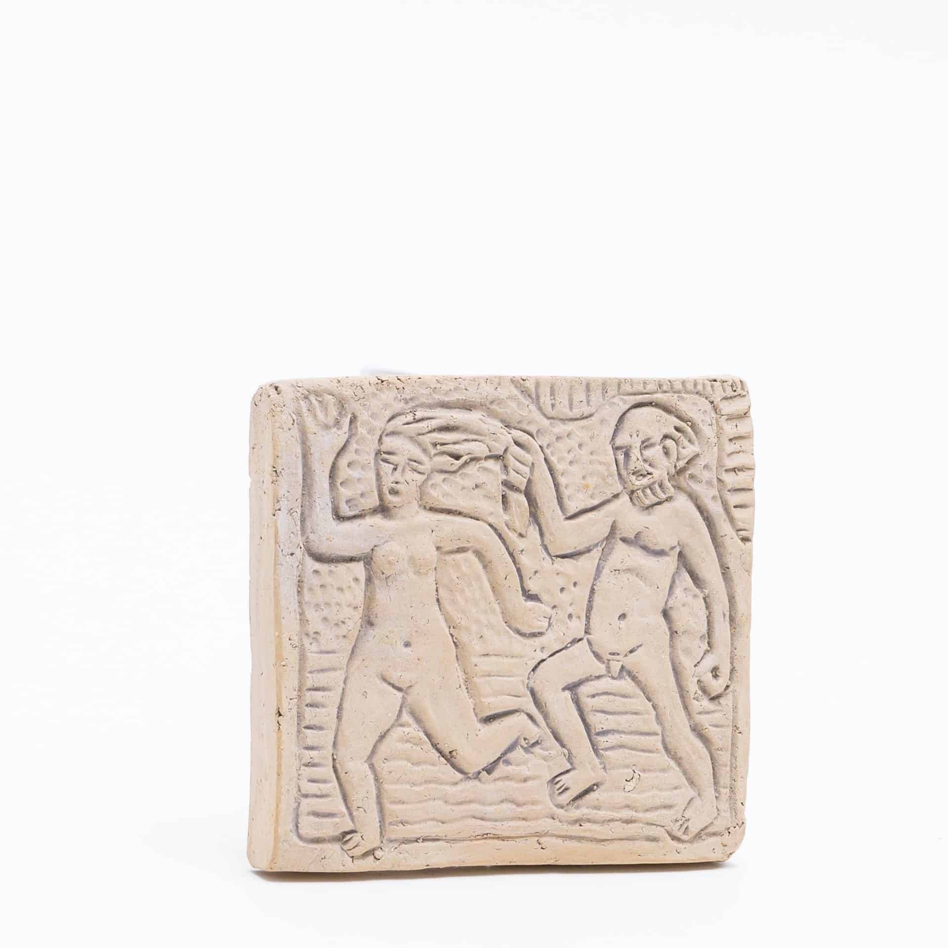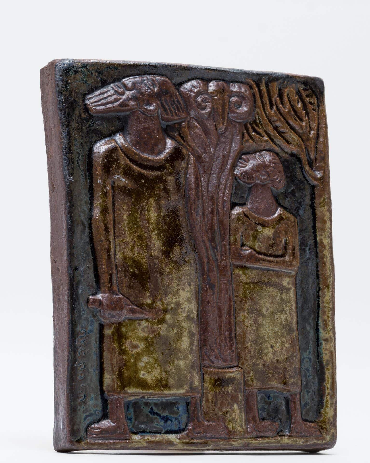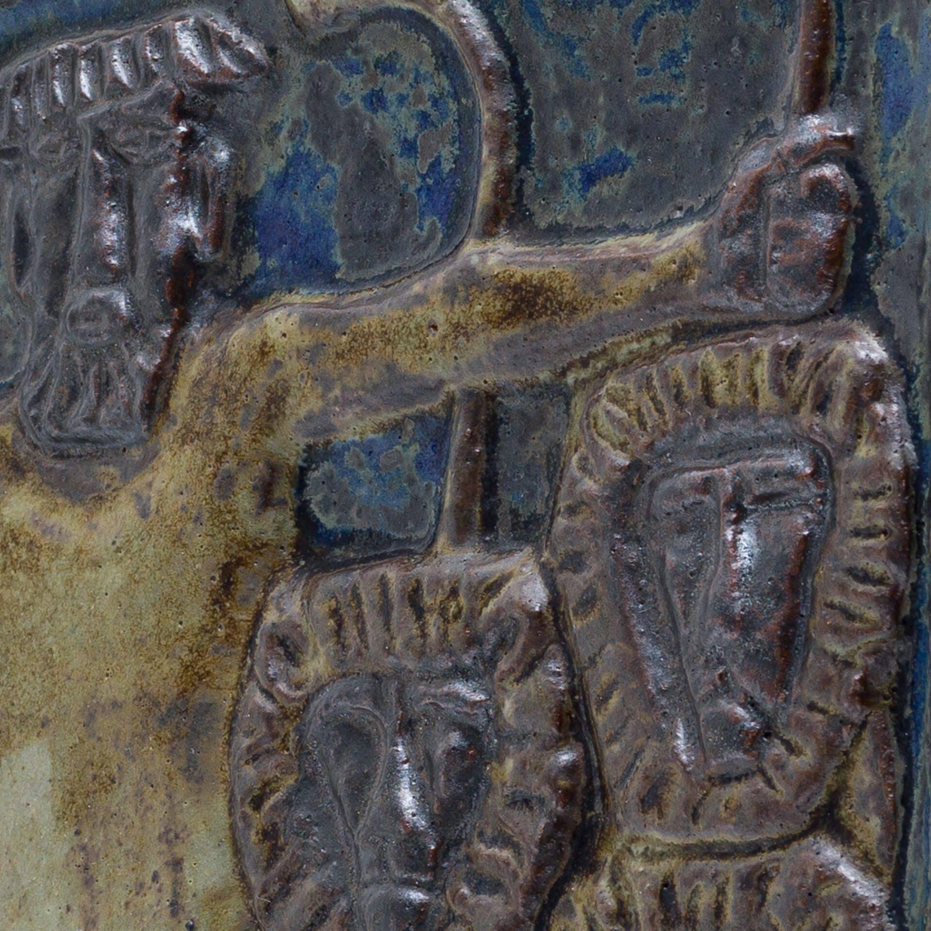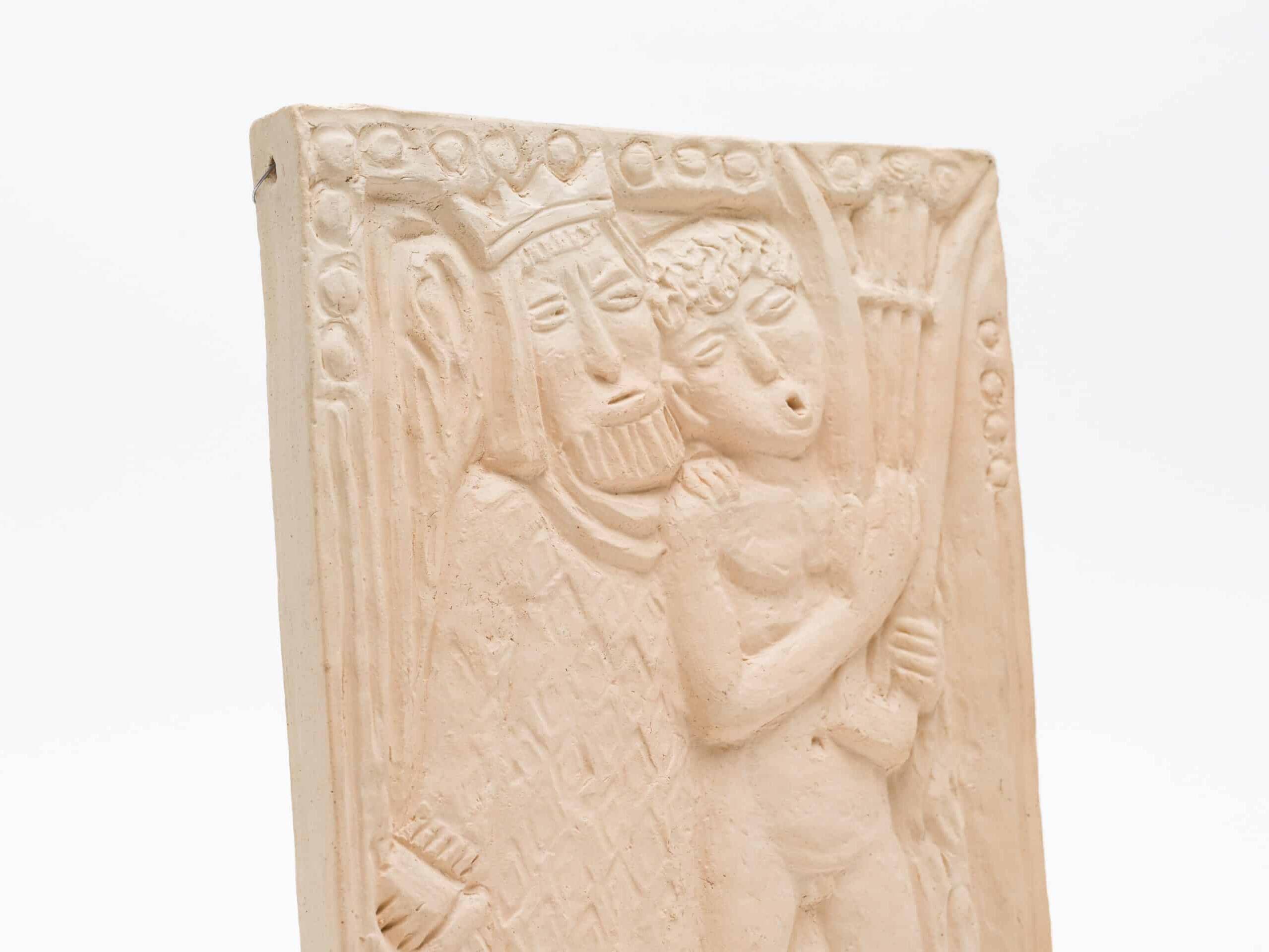 - 壁に掛ける物語、粘土の絵画ホルムにとって陶板やレリーフは、彫刻と素描への関心を結びつける格好の表現でした。当時、陶製のレリーフは絵画に代わる比較的手頃な芸術品と見なされており、壁に物語を飾りたいと願う人々のために、彼は粘土で絵画を描いたのです。そのインスピレーションは聖書だけでなく、膨大な美術書コレクションにあった古代ギリシャやローマ建築のフリーズ(帯状の彫刻)にもありました。