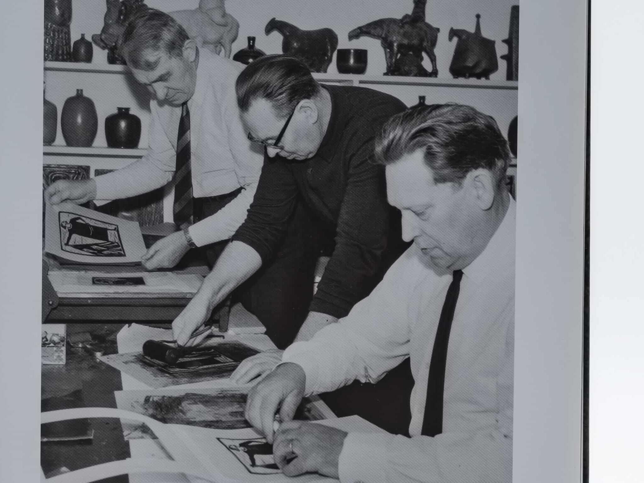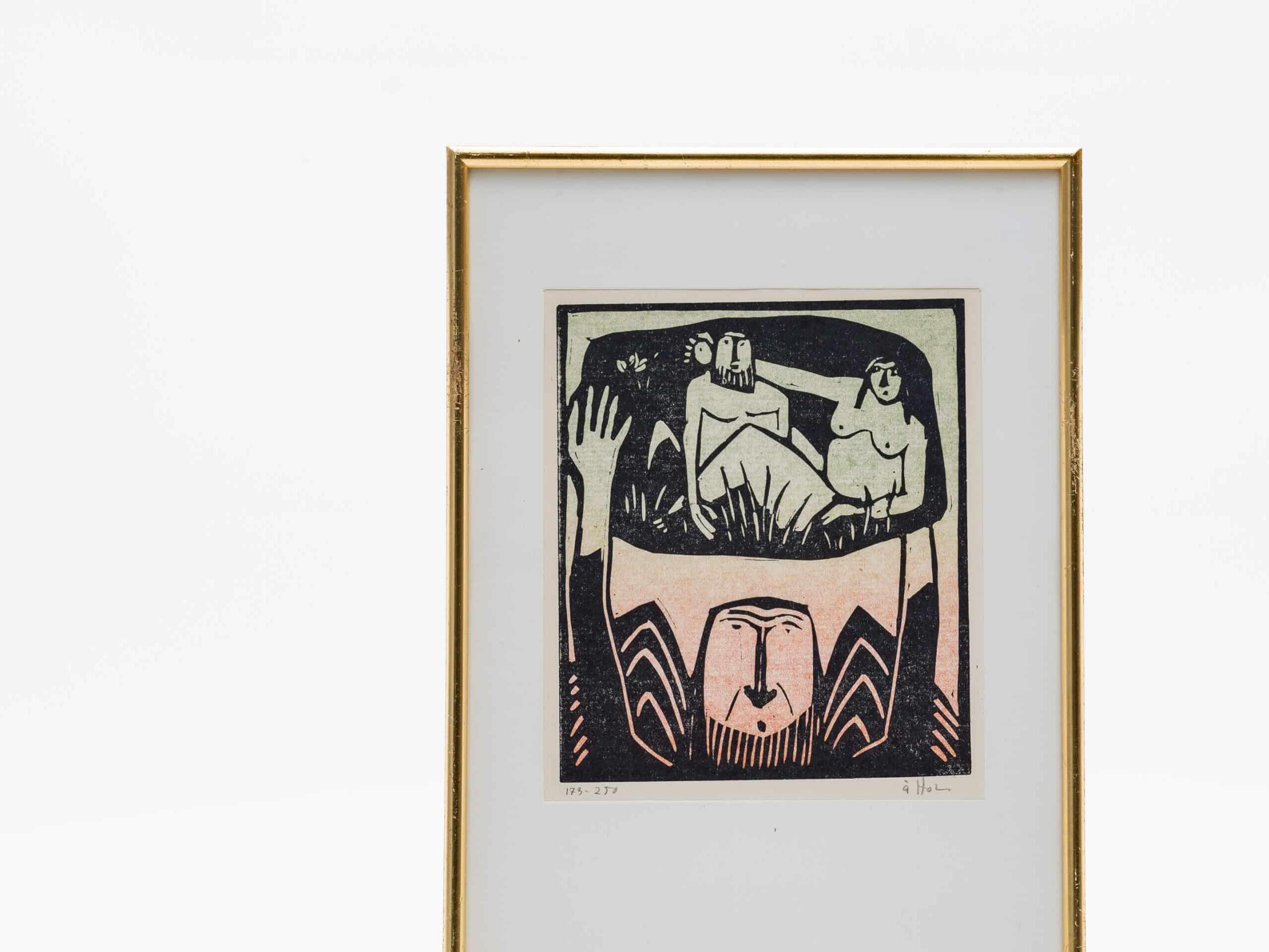 - 紙の上の魂、もうひとつの聖書粘土の彫刻家として知られますが、その創作意欲は紙の上にも注がれました。1966年、彼は愛するヘガネス博物館の増築資金を集めるため、版画制作を始めます。これは驚異的な成功を収め、15年間で実に275種類ものモチーフが生まれました。彼にとって「趣味」であったこの分野にも、聖書の世界がより自由な解釈で生き生きと描かれています。